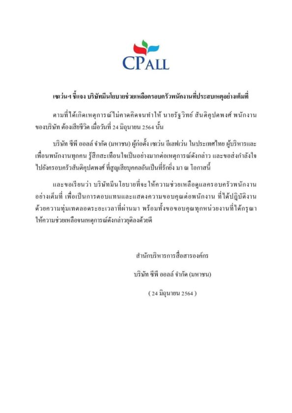 เซเว่นฯ ชี้แจง บริษัทมีนโยบายช่วยเหลือครอบครัวพนักงานที่ประสบเหตุอย่างเต็มที่