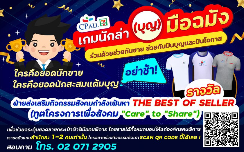 ฝ่ายส่งเสริมกิจกรรมสังคม บมจ. ซีพี ออลล์ กำลังเฟ้นหา THE BEST OF SELLER ทูตโครงการเพื่อสังคม “Care” to “Share” เพื่อกระตุ้นยอดขายกระเป๋าผ้าจากฝีมือคนพิการ ติดตามเพื่อเข้าร่วมกิจกรรมได้เร็ว ๆ นี้