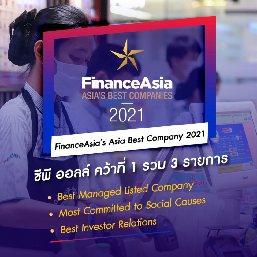 นิตยสารไฟแนนซ์เอเชีย (FinanceAsia) สื่อสิ่งพิมพ์ชั้นนำซึ่งได้รับการยอมรับในระดับภูมิภาค ตั้งแต่ปี 2539 ในฐานะผู้เผยแพร่ข่าวสาร และข้อมูลเชิงลึกด้านการเงิน และตลาดทุนขององค์กรในภูมิภาคเอเชียแปซิฟิก ได้ประกาศรายชื่อสุดยอดบริษัทแห่งเอเชีย ประจำปี 2564 (FinanceAsia Asia’s Best Companies 2021) ใน 6 ประเภท สำหรับประเทศไทย ปรากฎว่า บริษัท ซีพี ออลล์ จำกัด (มหาชน) ได้รับการยกย่องในฐานะสุดยอดองค์กรถึง 3 ด้าน ประกอบด้วย บริษัทจดทะเบียนที่มีการบริหารงานยอดเยี่ยม (Best Managed Listed Company) บริษัทที่มีความมุ่งมั่นสร้างสรรค์ประโยชน์เพื่อสังคมยอดเยี่ยม (Most Committed to Social Causes) และบริษัทด้านนักลงทุนสัมพันธ์ ยอดเยี่ยม (Best Investor Relations)