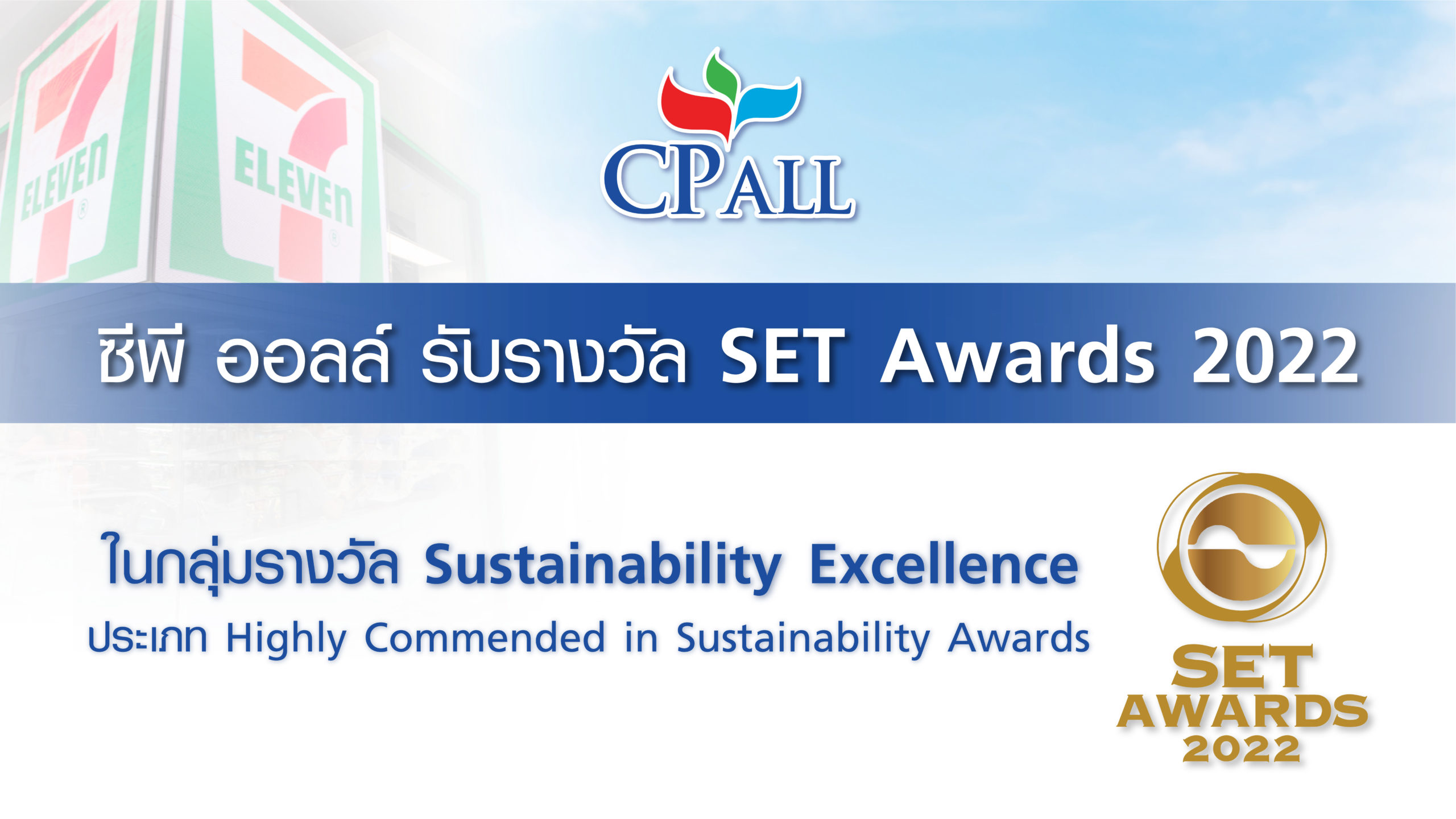 โดยในปีนี้ ซีพี ออลล์ ซึ่งอยู่ในกลุ่มบริษัทจดทะเบียนในตลาดหลักทรัพย์ ที่มีมูลค่าหลักทรัพย์ตามราคาตลาดสูงกว่า100,000 ล้านบาท ได้รับรางวัล SET AWARDS 2022 ในกลุ่มรางวัล Sustainability Excellence ประเภท Highly Commended in Sustainability Awards ซึ่งเป็นรางวัลที่มอบให้กับบริษัทจดทะเบียนที่ดำเนินธุรกิจตามแนวทางการพัฒนาอย่างยั่งยืน