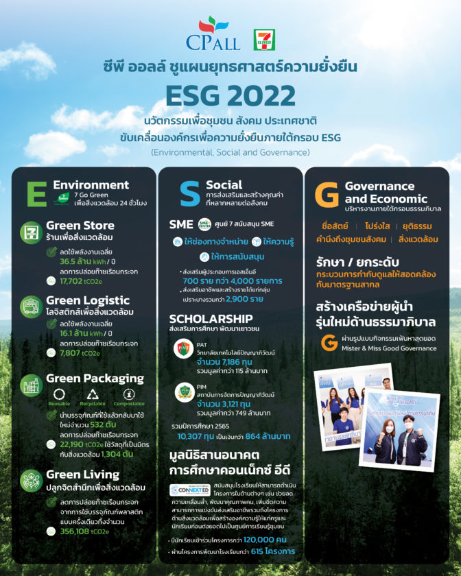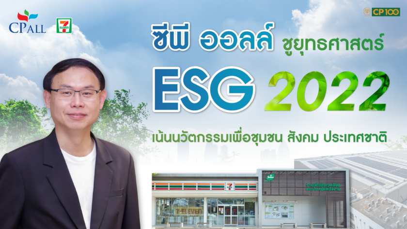 ซีพี ออลล์ ประกาศเป้าหมายดำเนินงานความยั่งยืนภายใต้ผลการดำเนินงานด้านสิ่งแวดล้อม สังคม และบรรษัทภิบาล ประจำปี 2565 (Environmental, Social and Governance : ESG 2022) โดยการส่งเสริมให้เกิดนวัตกรรมใหม่ๆเพื่อชุมชน สังคมและประเทศชาติอย่างยั่งยืน