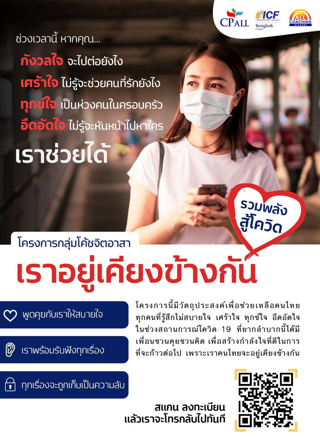 โดยขณะนี้มีทั้งบุคคลทั่วไปและองค์กรหลายหน่วยงานที่สนใจเข้าร่วมโครงการนี้ ทาง All Coaching Academy จึงร่วมกับโค้ชจิตอาสาอีกเกือบ 80 ท่านสานต่อโครงการ “เราอยู่เคียงข้างกัน” สำหรับบุคคลทั่วไป ที่อาจจะกำลังประสบปัญหา อุปสรรค และต้องการใครสักคนที่จะชวนคุย ชวนคิด เพื่อให้สามารถก้าวข้ามอุปสรรคที่กำลังเผชิญอยู่นี้ไปให้ได้ เพียงท่านสแกน QR code ในโปสเตอร์ที่แนบมานี้ ลงทะเบียน และโค้ชจิตอาสาจะติดต่อท่านไป โดยไม่มีค่าใช้จ่ายแต่อย่างใด