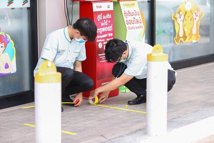 เพจCPALLแบ่งปันภาพพนักงานเซเว่น อีเลฟเว่น ช่วยกันอย่างขะมักเขม้นในการตีเส้นทั้งหน้าร้าน และ ภายในร้านบริเวณหน้าเคาน์เตอร์ เพื่อเป็นการเว้นระยะห่าง(social distance) สร้างความปลอดภัยและอุ่นใจของลูกค้าในการเข้ามาใช้บริการที่ร้าน และพร้อมรับใช้ให้บริการพี่น้องคนไทย