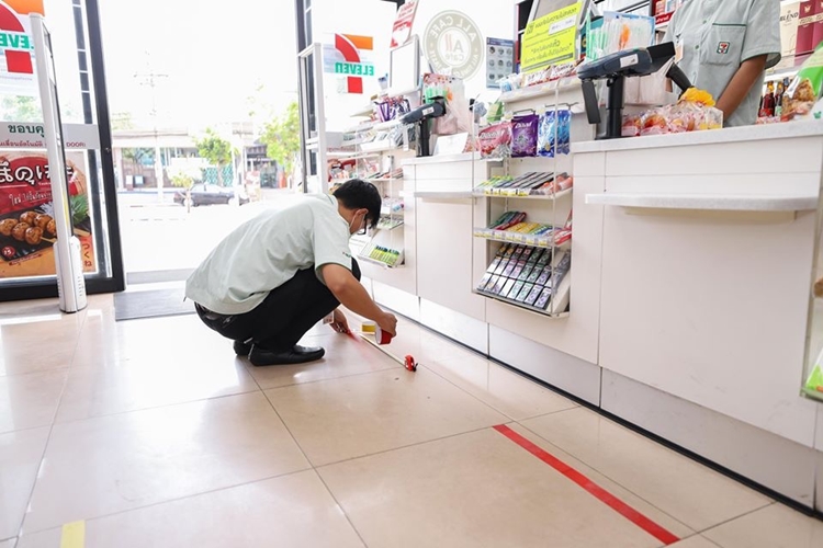 พนักงาน 7-11 ช่วยกันเตรียมความพร้อมเพิ่มความปลอดภัยของร้านด้วย social distance