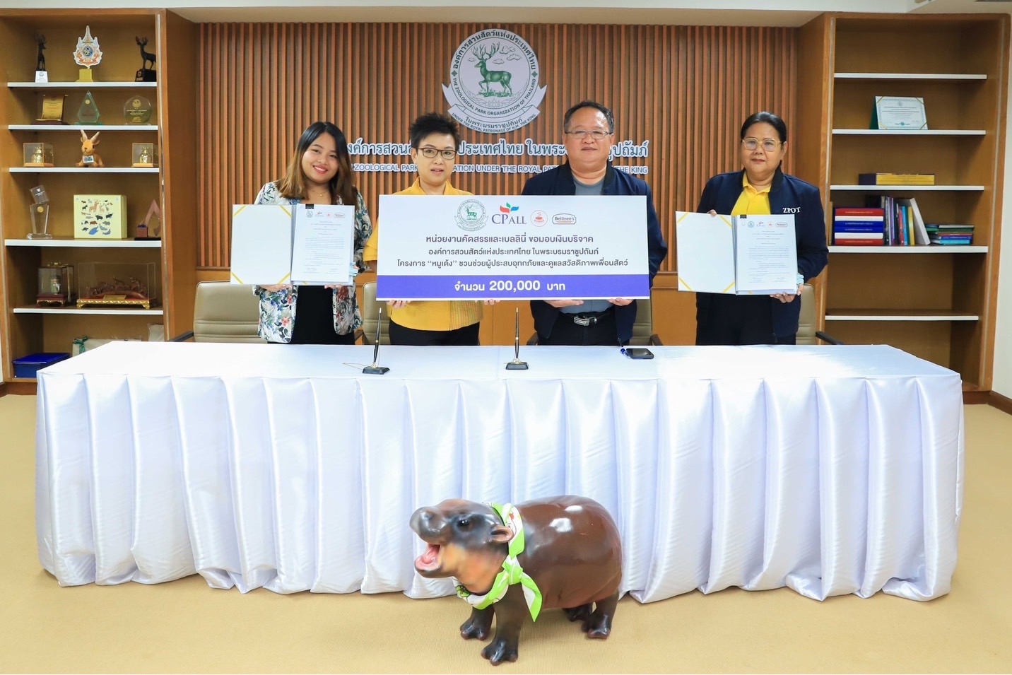 นายอรรถพร ศรีเหรัญ ผู้อำนวยการองค์การสัตว์แห่งประเทศไทย รับมอบเงิน จากหน่วยงานคัดสรรและเบลลินี่ พรีเมี่ยม คาเฟ่ ภายใต้การบริหารงานของ ซีพี ออลล์ โดยมี นางสาวนุชรัตน์ พรพุทธษา ผู้จัดการทั่วไปอาวุโส บมจ.ซีพี ออลล์ เป็นผู้แทนส่งมอบเงินบริจาค ผ่านโครงการ “หมูเด้ง” ชวนช่วยผู้ประสบอุทกภัยและดูแลสวัสดิภาพเพื่อนสัตว์ เพื่อสนับสนุนในการดูแลชีวิตและสวัสดิภาพของสัตว์ป่านานาชนิด ขององค์การสวนสัตว์แห่งประเทศไทย  ในพระบรมราชูปถัมถ์ ( อสส. ) ณ องค์การสวนสัตว์แห่งประเทศไทย