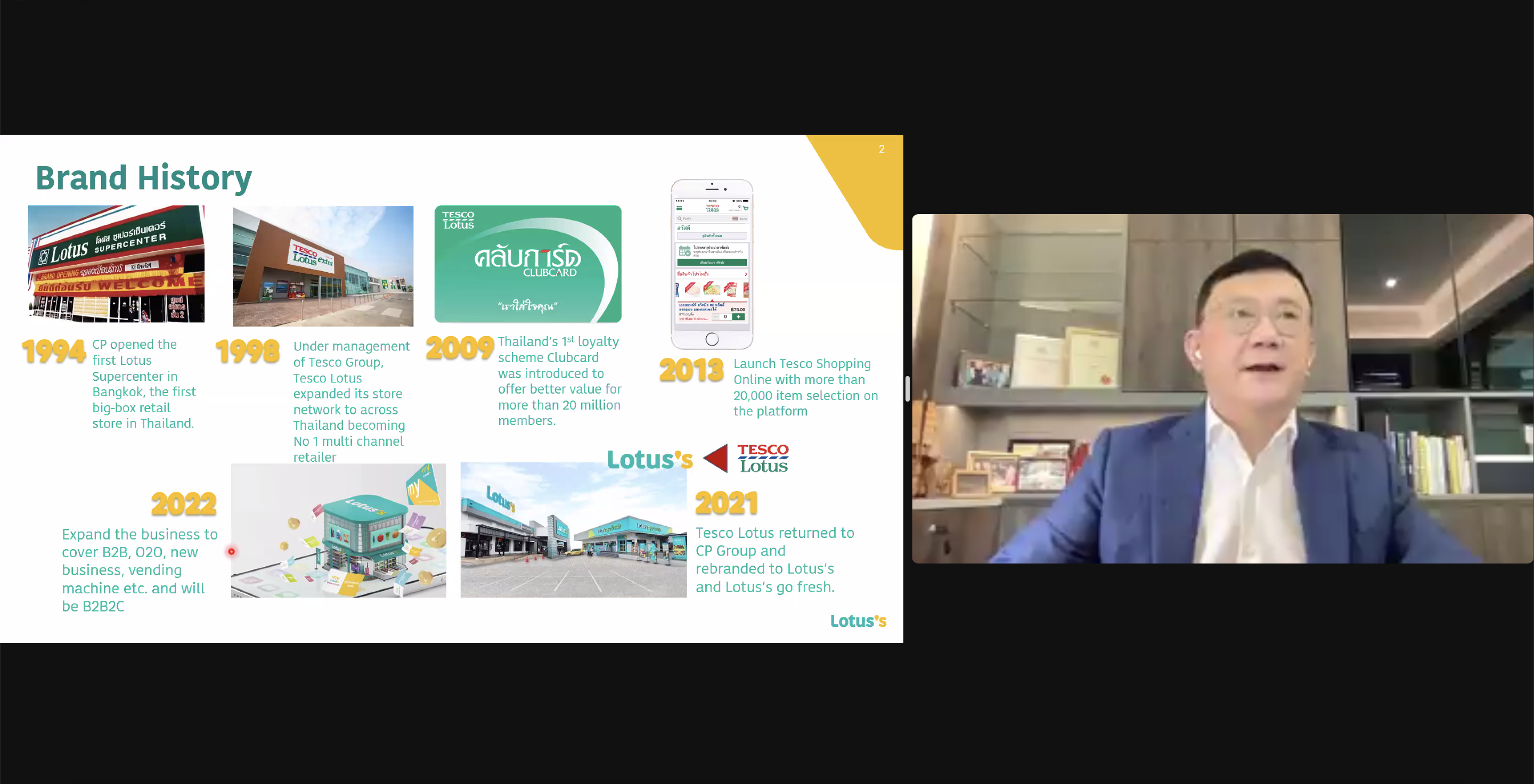 คุณสมพงษ์ รุ่งนิรัติศัย ประธานคณะผู้บริหารธุรกิจโลตัสประเทศไทย เป็นหนึ่งในทีมบุกเบิกธุรกิจค้าปลีกของซีพี เล่าถึงที่มาของการทำธุรกิจค้าปลีกว่า เครือฯ บุกเบิกธุรกิจไฮเปอร์มาร์เก็ตภายใต้ชื่อ โลตัส โดยเปิดสาขาแรกที่ห้างสรรพสินค้าซีคอนสแควร์ เมื่อปี 1994 และทยอยเปิดตามหัวเมืองในไทย รวมทั้งหมด 13 สาขา ก่อนจะขายให้เทสโก้กรุ๊ป