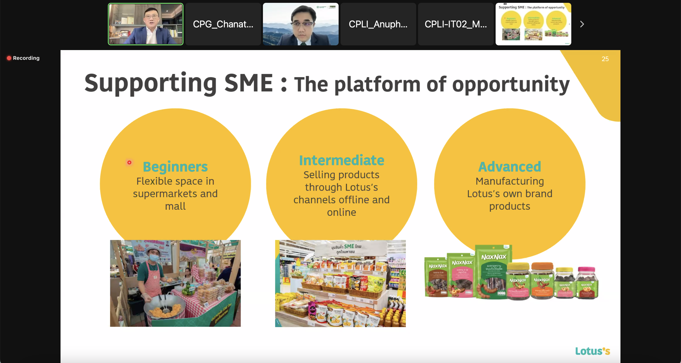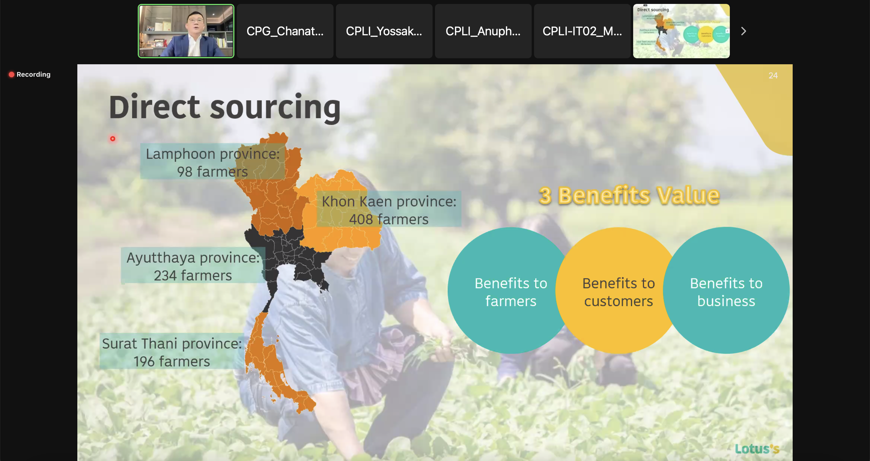นอกจากนี้ โลตัสกำหนดกลยุทธธุรกิจที่นำไปสู่ความยั่งยืน โดยยึดหลักสามประโยชน์ซึ่งเป็น 1 ใน 6 ข้อค่านิยมเครือซีพี ด้วยการมุ่งส่งเสริมและสนับสนุนเกษตรกรสอดรับวิสัยทัศน์คุณศุภชัย เจียรวนนท์ ประธานคณะผู้บริหารเครือฯ ที่มีนโยบายให้เกิด “แพลตฟอร์มแห่งโอกาส” เพื่อเป็นช่องทางให้แก่เอสเอ็มอีและเกษตรกร รวมทั้งลูกค้าให้ได้รับความคุ้มค่าด้านราคา และสามารถลดต้นทุนลงได้ โดยแพลตฟอร์มแห่งโอกาส ไม่เพียงนำผลผลิตหรือสินค้าเข้ามาขายในพื้นที่มอลล์เท่านั้น แต่ยังให้ความรู้ รวมถึงต่อยอดนำเข้ามาขายในโลตัส ช่วยพัฒนาแบรนด์ของเอสเอ็มอี ขับเคลื่อนให้มีตรายี่ห้อกระจายจัดจำหน่ายได้ทั่วประเทศหรืออาจส่งออกต่างประเทศได้ด้วย
