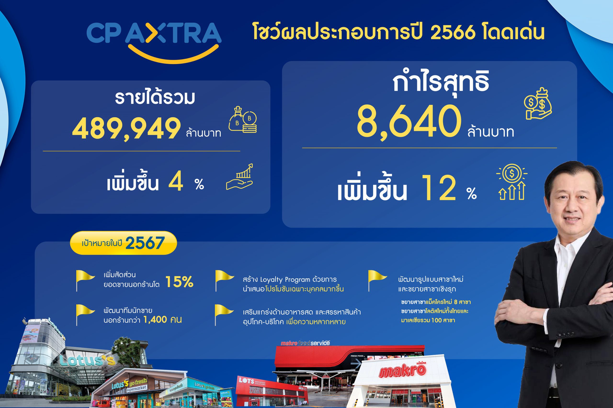 นายธานินทร์ บูรณมานิต ประธานเจ้าหน้าที่บริหาร บริษัท ซีพี แอ็กซ์ตร้า จำกัด (มหาชน) เปิดเผยว่าผลการดำเนินงานปี 2566 ทำรายได้รวม 489,949 ล้านบาท และมีกำไรสุทธิ 8,640 ล้านบาท โต 4% และ 12% จากปีก่อน ตามลำดับ โดยในไตรมาส 4 ปี 2566 ถือเป็นไตรมาสที่มีผลการดำเนินงานดีที่สุดในรอบปีที่ผ่านมา จากปัจจัยบวกหลายด้าน อาทิ (1) ยอดขายสาขาเดิม (Same Store Sale) และการเปิดบริการสาขาใหม่ พร้อมปรับโฉมสาขารูปแบบใหม่ที่มีต่อเนื่องทั้งปีของทั้งแม็คโคร-โลตัส (2) การเพิ่มสัดส่วนยอดขายนอกสาขา ผ่านแอปพลิเคชัน Makro PRO, Lotus’s SMART App และทีมนักขาย (B2B Salesforce) ที่เพิ่มขึ้น 38% จากช่วงเดียวกันของปีก่อน โดยการขยายบริการจัดส่งสินค้าได้ในวันเดียว (Same Day Delivery) (3) สินค้าอาหารสดเติบโตดีอย่างต่อเนื่อง (4) การเพิ่มพื้นที่ให้เช่าจากการปรับพื้นที่ศูนย์การค้า