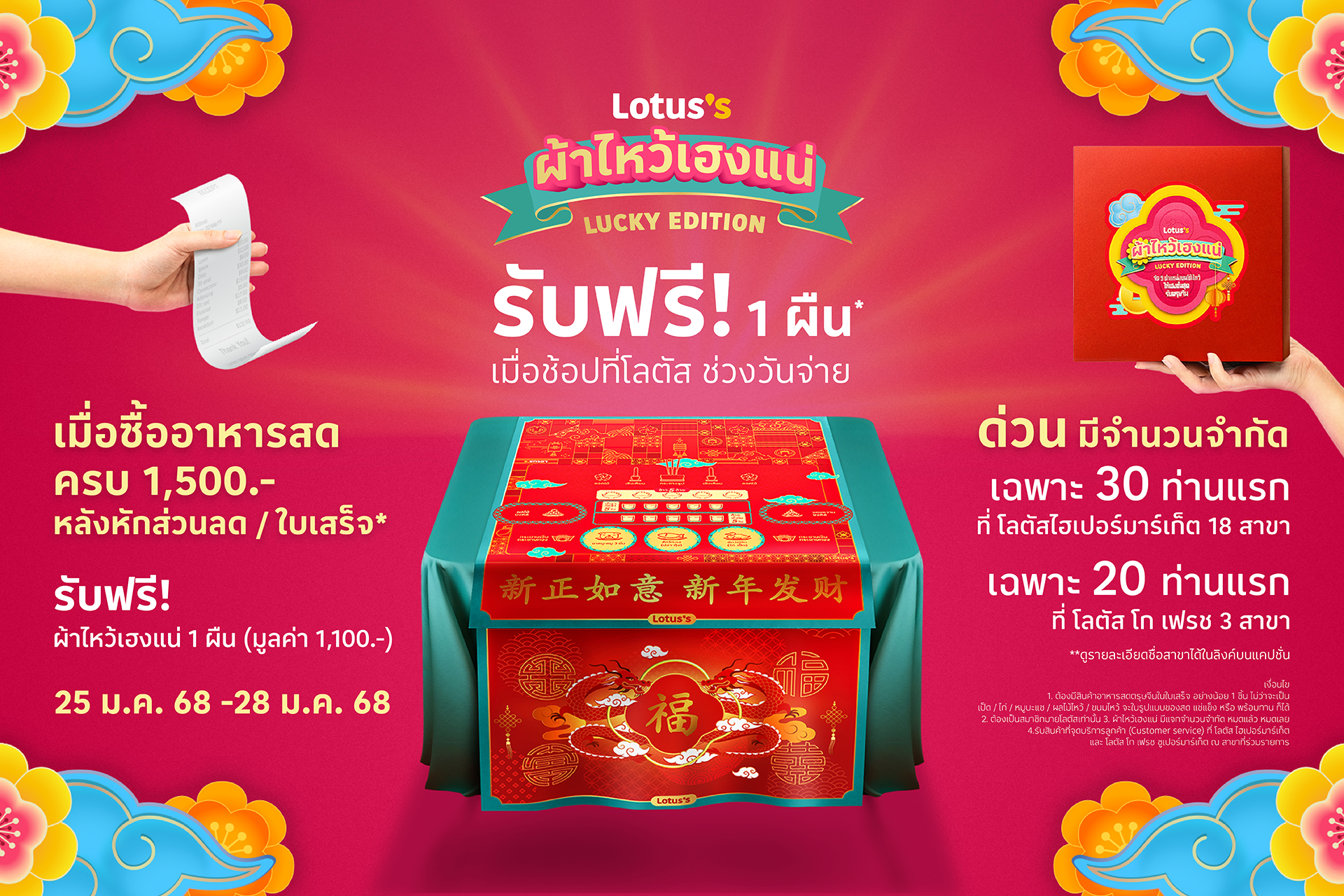 อินเทรนด์ เฮงแบบตรงจุด แถมเฮงไม่ได้แค่ไหว้ แต่นำของไหว้มากินต่อ และมีไอเทมเสริมเฮงวันเที่ยวผ่านสติกเกอร์มงคลอวยพรตรุษจีน เฮงได้ยิ่งขึ้น- ผ้าไหว้เฮงแน่ lucky edition เพียงซื้อสินค้าอาหารสด ครบ 1,500 บาท ช่วงวันจ่าย (25 – 28 ม.ค. 68) รับฟรี 1 ชุด / ใบเสร็จ เฉพาะโลตัส 21 สาขาที่ร่วมรายการ