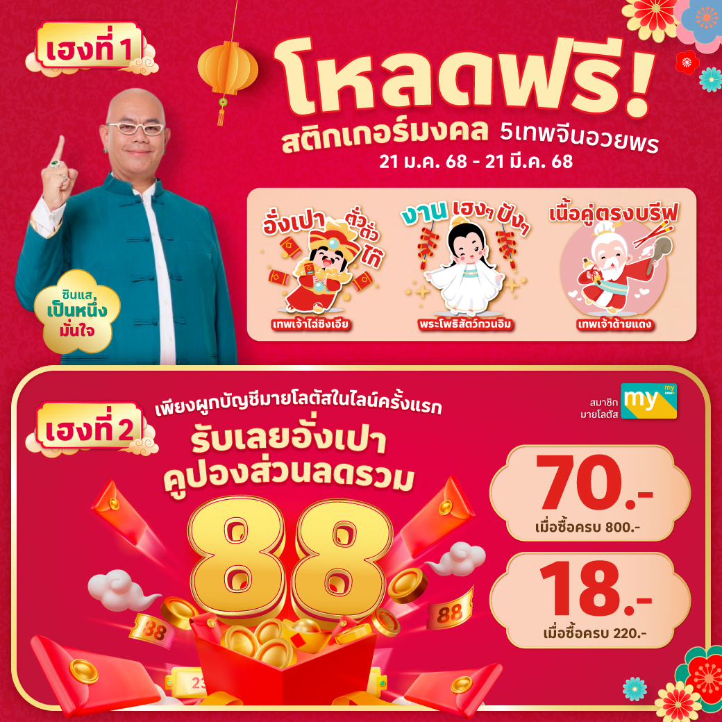 - อวยพรเฮง กับ “สติกเกอร์มงคล” โดยซินแสเป็นหนึ่ง ร่วมกับ Lotus’s นำ 5 เทพจีนชื่อดัง มาอวยพรวันตรุษจีน ให้เฮงตลอดปี ผ่าน “สติกเกอร์มงคล” ให้เฮงทั้งคนส่ง และ คนรับ เพียงเป็นเพื่อนกับ LINE Lotus’s และ Lotus’s Go Fresh ก็สามารถดาวน์โหลดฟรี! ตั้งแต่วันนี้ถึง 21 มีนาคม 2568 นอกจากนี้ ยังเฮงต่อเนื่อง รับอั่งเปาส่วนลดมูลค่ารวม 88 บาท เพียงผูกบัญชีมายโลตัสในไลน์ครั้งแรก รับคูปองส่วนลดผ่านโลตัส สมาร์ท แอป โดยรับส่วนลด 70 บาท เมื่อซื้อครบ 800 บาท หรือรับส่วนลด 18 บาท เมื่อซื้อครบ 220 บาท ถึงวันที่ 29 มกราคมนี้เท่านั้น โดยสามารถใช้คูปองส่วนลดได้ที่โลตัส ทุกสาขา และ โลตัส ช้อป ออนไลน์