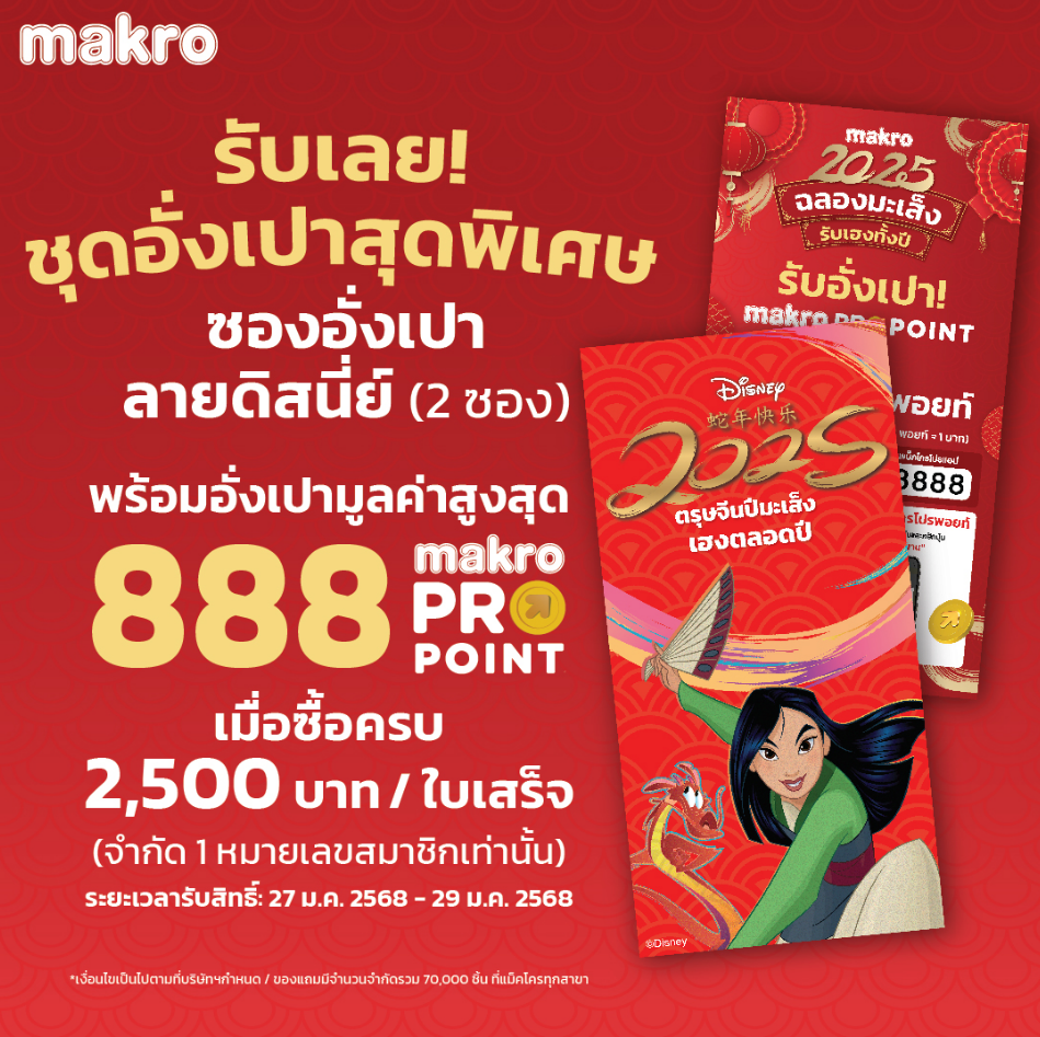 - แม็คโคร จัดแคมเปญ “ตรุษจีนปีมะเส็ง เฮงตลอดปี” จัดเต็มสินค้า และชุดของไหว้มงคลราคาพิเศษ พร้อมแนะเคล็ดลับ ไหว้ให้รวย ไหว้ให้เฮง โดยหมอบอย เคลียร์ชัด พร้อมแจกอั่งเปารับเฮงเฉพาะสมาชิกแม็คโคร เมื่อลูกค้าซื้อสินค้าที่ร่วมรายการครบ 2,500 บาท/ใบเสร็จ มีสิทธิ์ลุ้นรับอั่งเปา มูลค่าสูงสุด 888 Makro Pro Point และรับป้ายเสริมสิริมงคล จำนวนจำกัด หมดแล้วหมดเลย ที่แม็คโครทุกสาขา