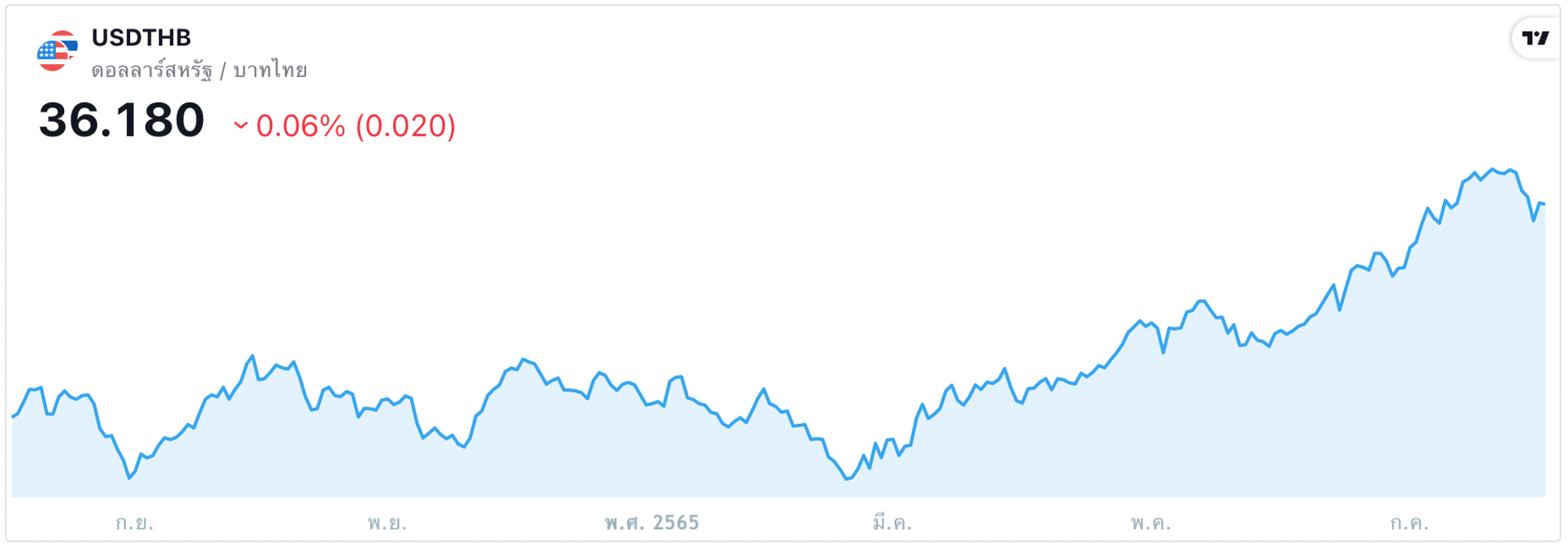 - ตั้งแต่ต้นปีนี้ เงินบาทอ่อนค่าลง 10.3% เมื่อเทียบกับดอลลาร์สหรัฐฯ เนื่องจากแรงกดดันจากภาวะเศรษฐกิจโลก และแนวโน้มการเร่งคุมเข้มนโยบายการเงินของสหรัฐ
