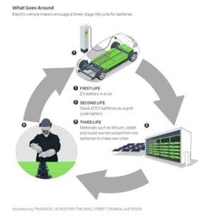 - แบตเตอรี่ EV เสื่อมโทรมเมื่อมีการชาร์จและคายประจุ ผู้เชี่ยวชาญกล่าวว่าผู้ขับขี่สามารถคาดหวังการใช้งานได้มากกว่า 100,000 ไมล์ก่อนที่แบตเตอรี่จะสูญเสียความจุ 20% ขึ้นไป ซึ่งเป็นจุดที่ประสิทธิภาพลดลงอย่างเห็นได้ชัด แต่ยังคงมีประโยชน์สำหรับการจัดเก็บกริดจนกว่าความจุจะลดลงเหลือประมาณ 60% ซึ่งอาจให้บริการได้อีกเป็นเวลา 10 ถึง 15 ปี