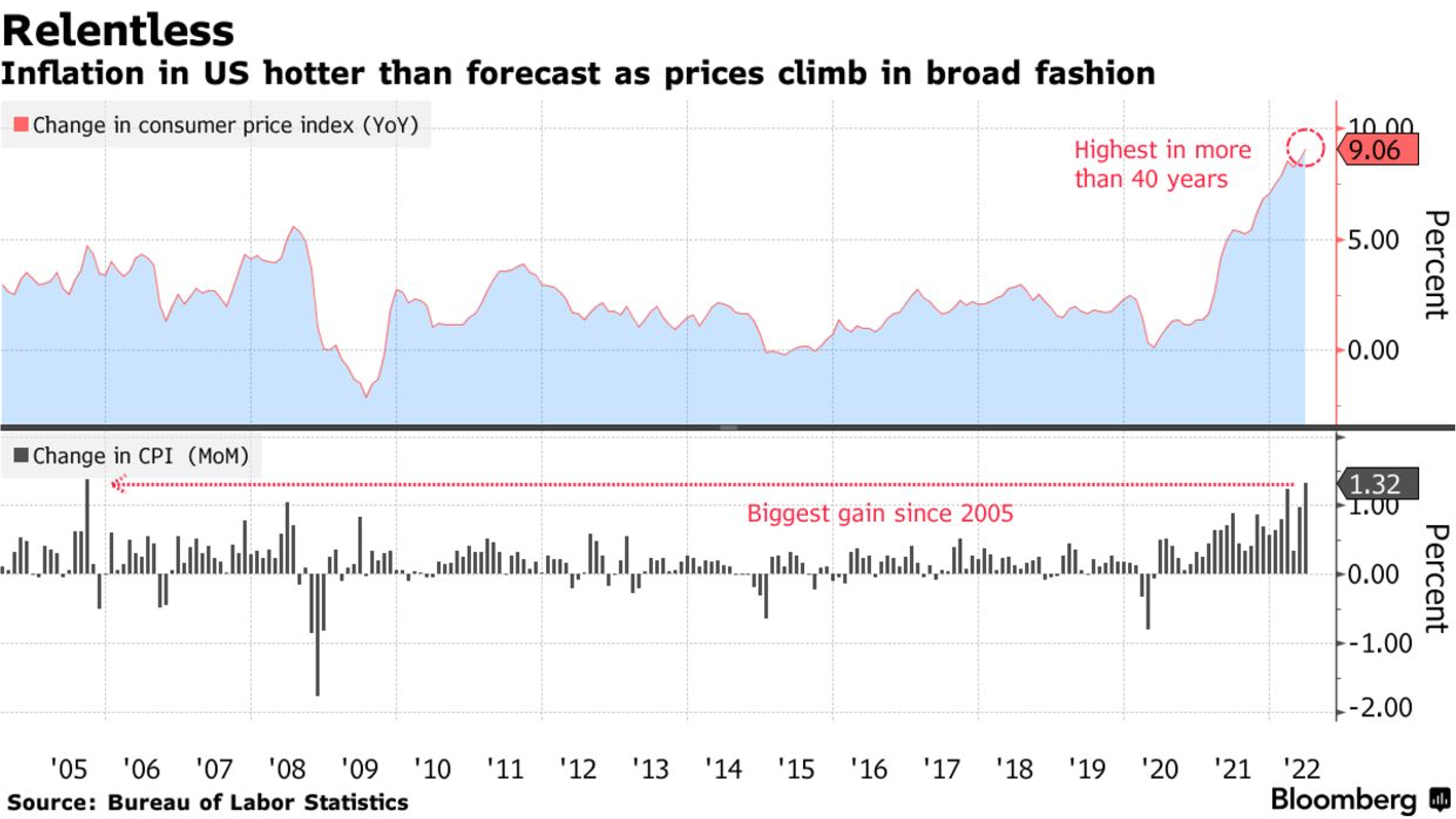 สหรัฐอเมริกาเงินเฟ้อพุ่งสูงแตะ 9.1% สูงในรอบ 41 ปี เฟดอาจขึ้นดอกเบี้ยแรง 1% (บลูมเบิร์ก)