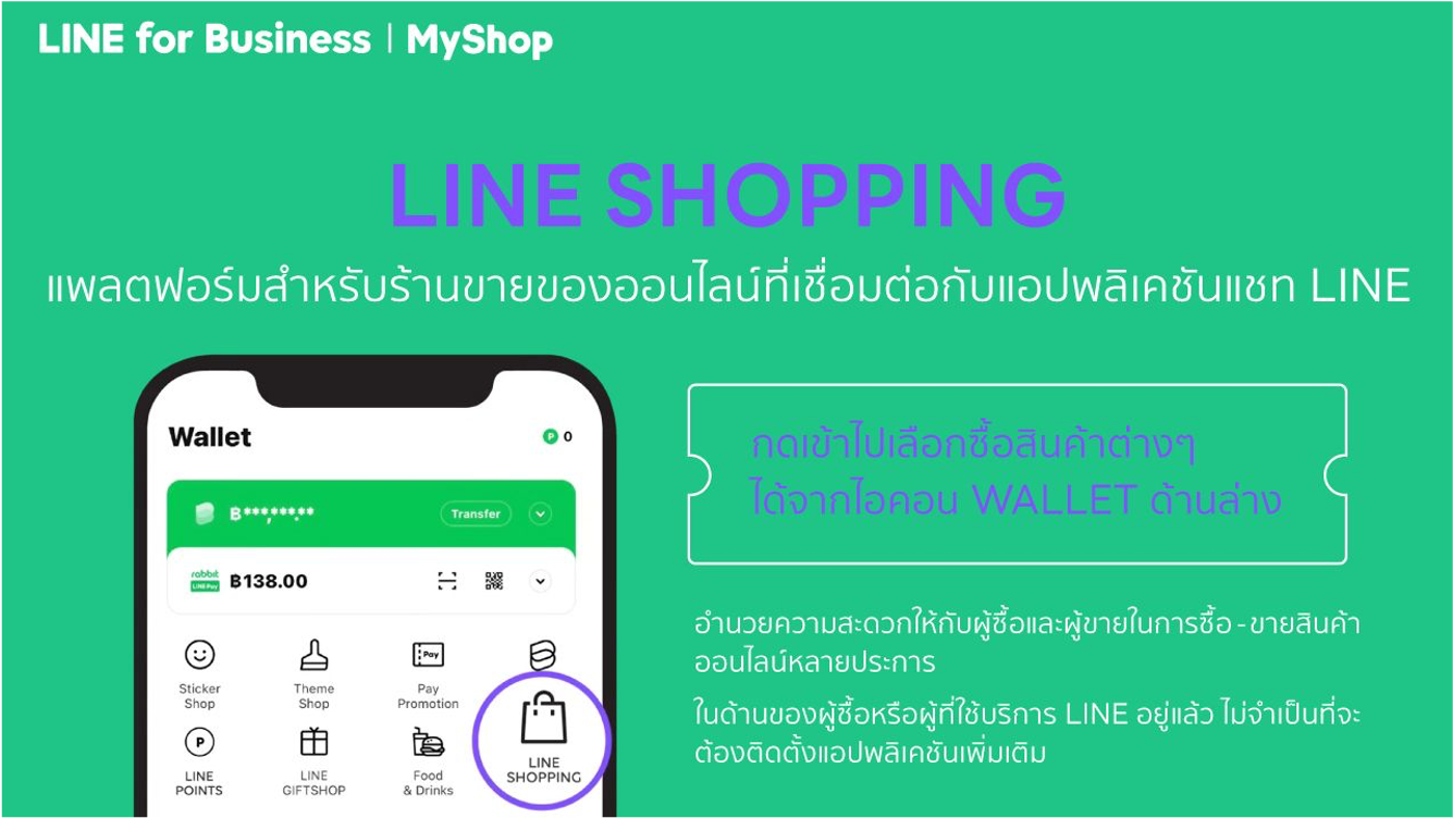 - สำหรับ LINE ในไทย มีผู้ใช้งานจำนวนกว่า 53 ล้านคน และบัญชีทางการสำหรับธุรกิจ 5 ล้านบัญชี ผู้ใช้งาน LINE SHOPPING 12 ล้านคนต่อเดือน โดยเฉลี่ยซื้อสินค้ามูลค่า 1,000 – 1,200 บาทต่อคำสั่งซื้อ จากกว่า 436,000 ร้านค้า สินค้ายอดนิยมได้แก่ อาหาร แฟชั่น และสุขภาพและความงาม (กรุงเทพธุรกิจ)
