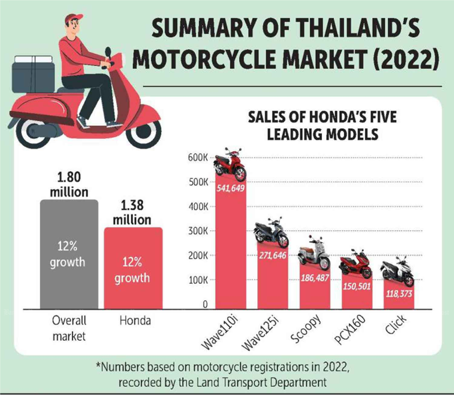 - ภาพรวมตลาดรถจักรยานยนต์ไทยปี 2022 มีแนวโน้มที่ดีขึ้น โดยตลาดรวมมียอดจดทะเบียนอยู่ที่ 1.80 ล้านคัน เติบโตขึ้นจากปีที่ผ่านมา 12%