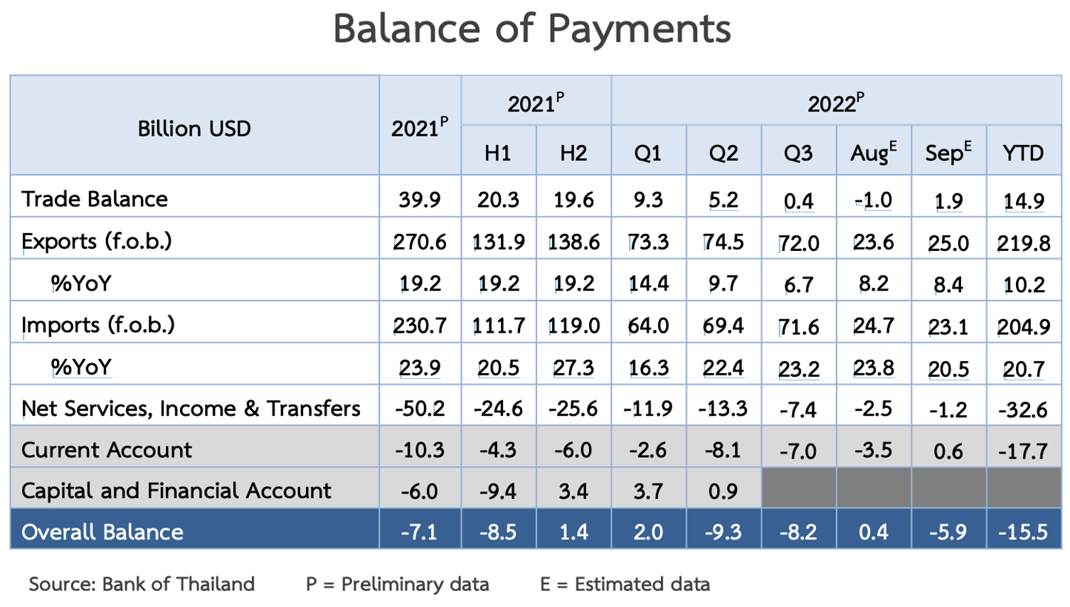 • ส่งผลให้ไตรมาส 3 ดุลบัญชีเดินสะพัดขาดดุลอยู่ที่ 7 พันล้านดอลลาร์ ลดลงจากไตรมาสก่อน ที่ขาดดุลที่ 8.1 พันล้านดอลลาร์ และยอดสะสมตั้งแต่ต้นปี ถึง ก.ย. ขาดดุลสะสม 17.7 พันล้านดอลลาร์ ด้านการส่งออกไตรมาส 3 ขยายตัวอยู่ที่ 6.7% ขณะที่การนำเข้า ขยายตัว 23.2% ด้านการบริการ นักท่องเที่ยวต่างชาติเพิ่มขึ้นอย่างต่อเนื่อง ตั้งแต่ต้นปี 2565 จนถึงก.ย. เข้ามาแล้ว 5.6 ล้านคน