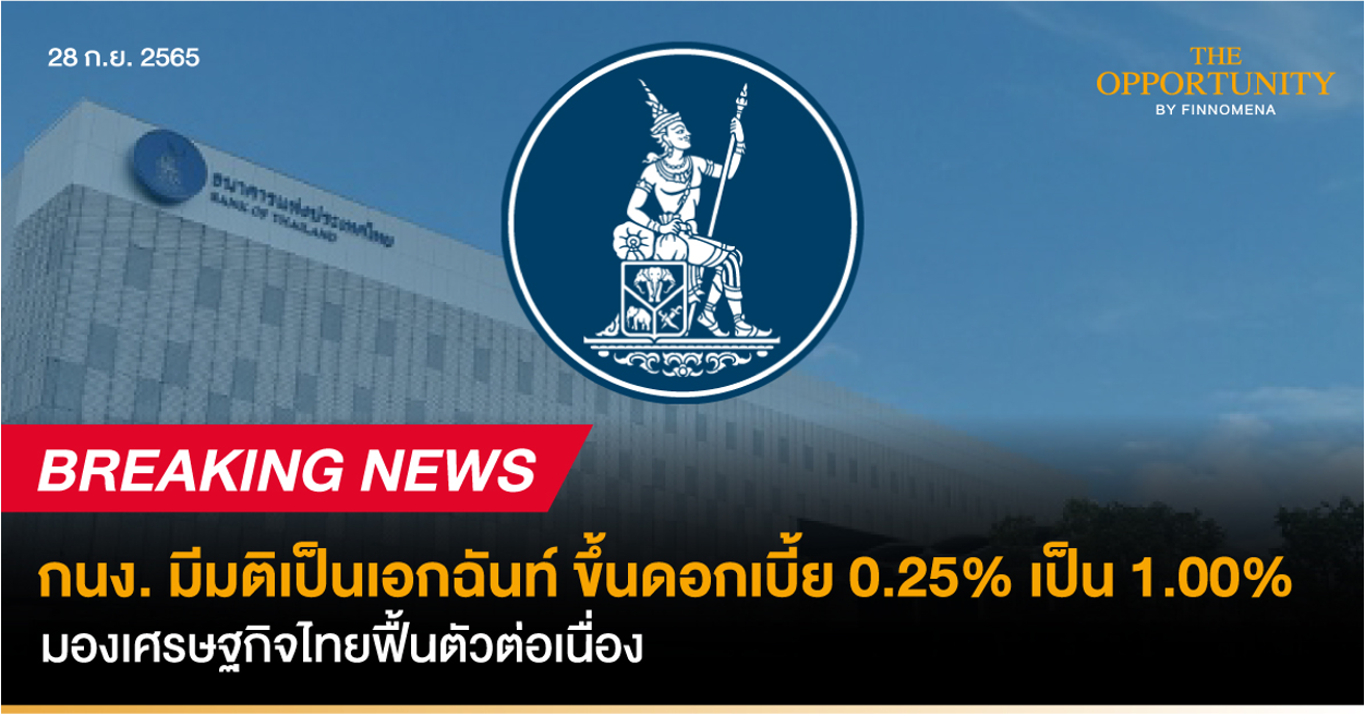 กนง. มีมติเป็นเอกฉันท์ ขึ้นดอกเบี้ย 0.25% เป็น 1.00% มองเศรษฐกิจไทยฟื้นตัวต่อเนื่อง
