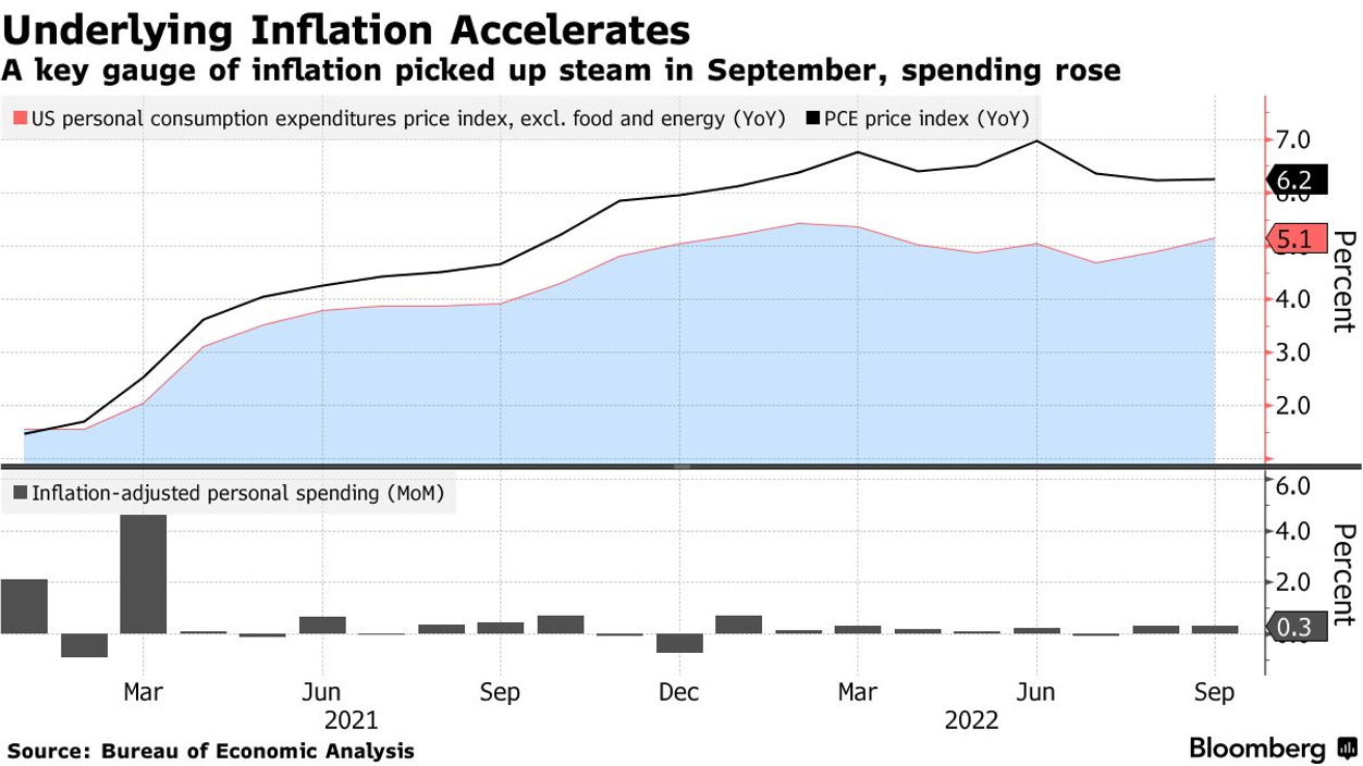 - สำนักงานสถิติกระทรวงแรงงานสหรัฐ เปิดเผยดัชนีราคาจากรายจ่ายเพื่อการบริโภคส่วนบุคคล (PCE พื้นฐาน) ซึ่งไม่นับรวมหมวดอาหารและพลังงาน และเป็นมาตรวัดอัตราเงินเฟ้อ เพิ่มขึ้น 5.1% ในเดือนกันยายนเมื่อเทียบรายปี สูงกว่าระดับ 4.9% ในเดือนสิงหาคม จึงมีแนวโน้มที่จะขึ้นอัตราดอกเบี้ยอีก 0.75% ในการประชุมสัปดาห์หน้า
