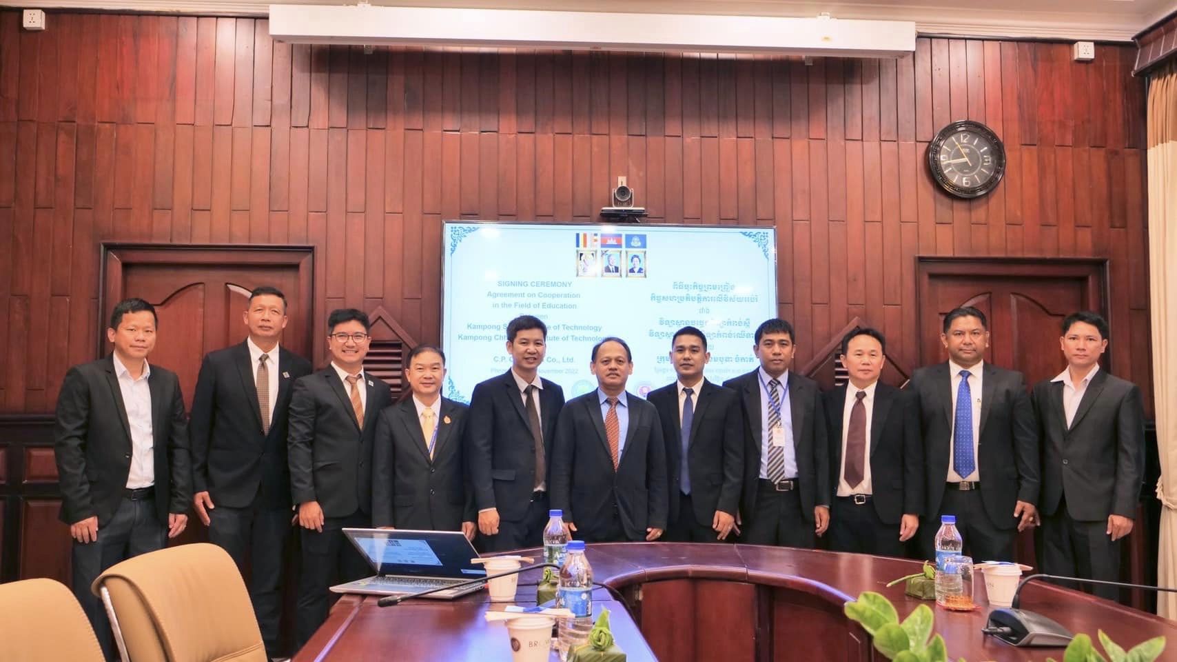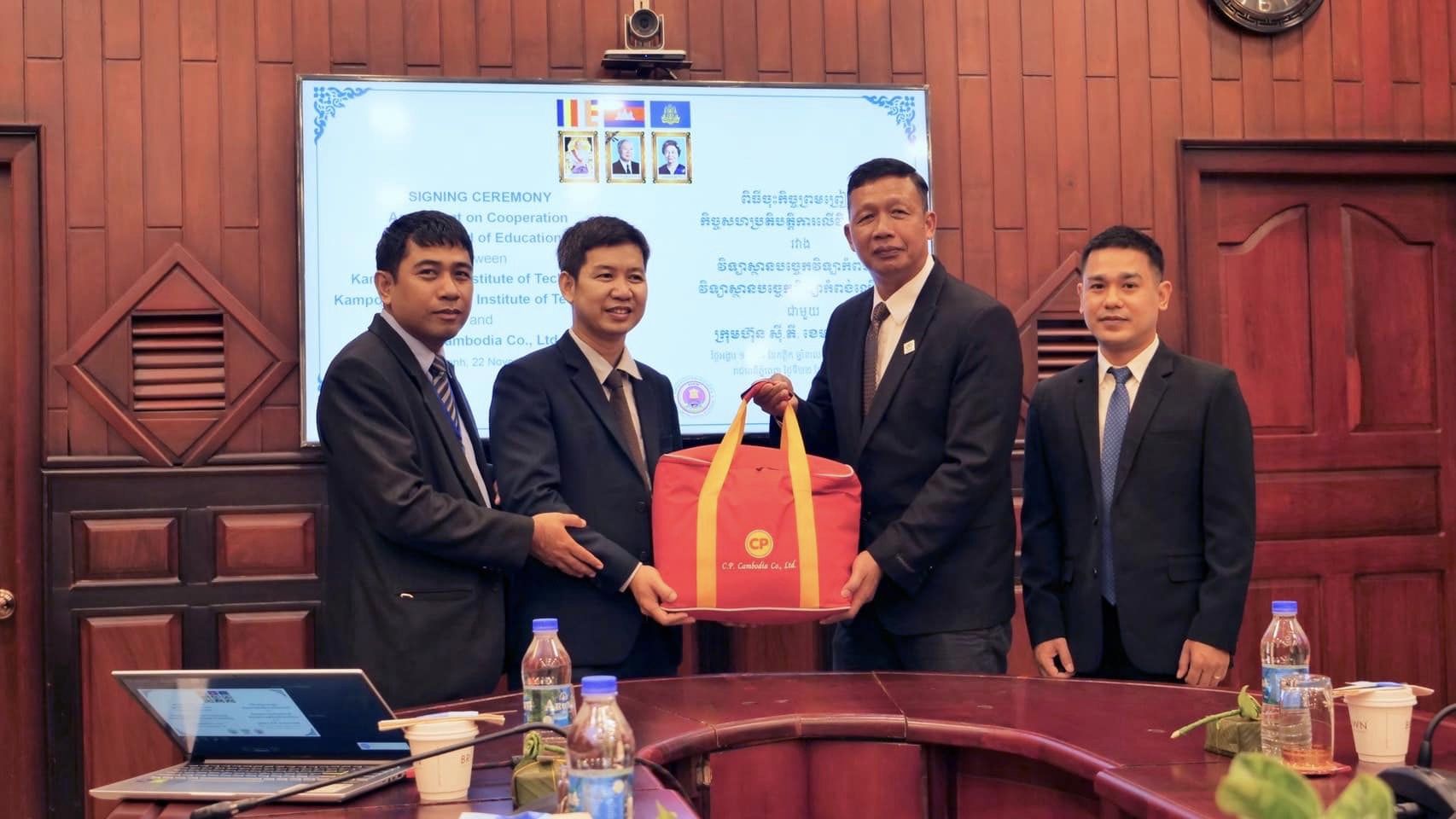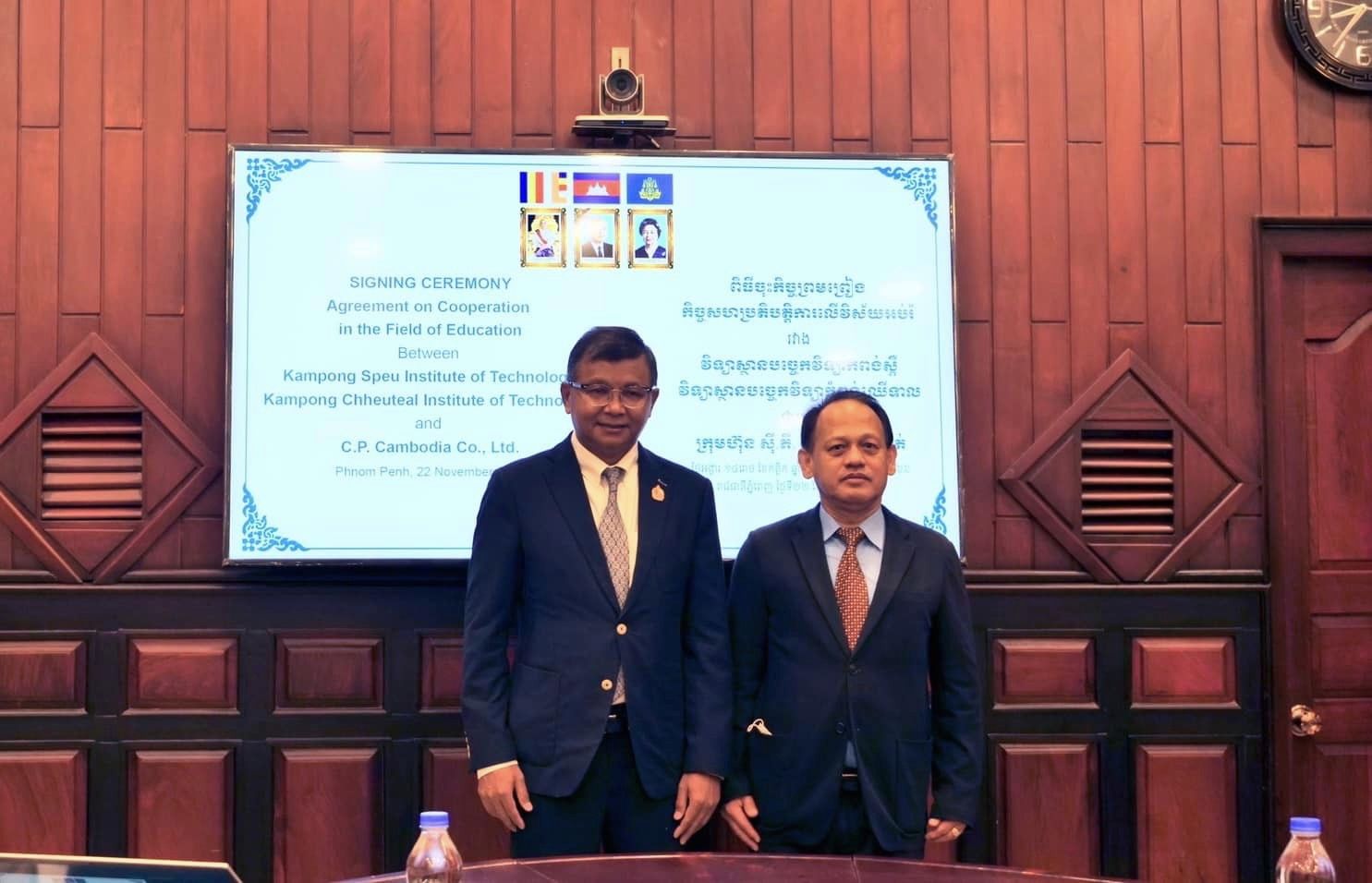 คุณวิทยา เกรียงไกรวิทย์ กรรมการผู้จัดการเขตประเทศราชอาณาจักรกัมพูชา บริษัท ซี.พี. กัมพูชา จำกัด หรือ ซี.พี. กัมพูชา พร้อมด้วย ดร.ฮง กิมเจียง ผู้อำนวยการสถาบันเทคโนโลยีกำปงสปือ และ ดร.เป็ก เซียง ผู้อำนวยการสถาบันเทคโนโลยีกำปงเฌอเตียล ร่วมลงนามข้อตกลงความร่วมมือส่งเสริมการเรียนการสอน ระหว่าง ซี.พี. กัมพูชา สถาบันเทคโนโลยีกำปงศปือ และสถาบันเทคโนโลยีกำปงเฌอเตียล โดยได้รับเกียรติจาก ดร.ฮอง จวน นารน รัฐมนตรีว่าการกระทรวงศึกษาธิการ เยาวชน และกีฬา ของกัมพูชา เป็นประธานในพิธีลงนามฯ