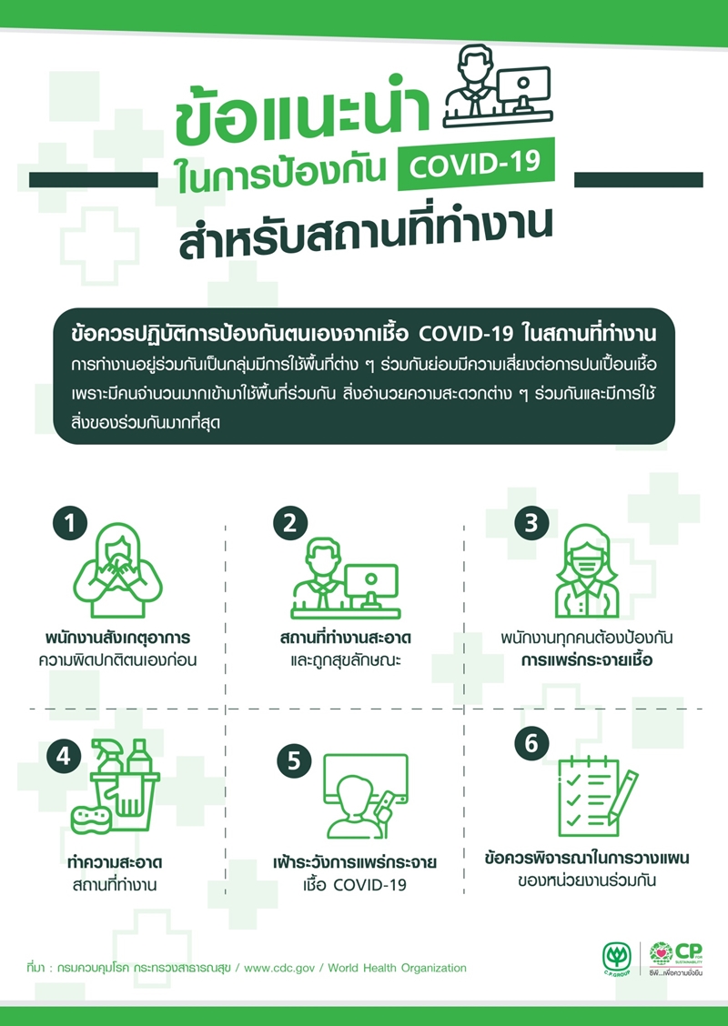 นอกจากมาตรการของรัฐบาลที่ออกมาเป็นระยะๆ แล้วประชาชนเองก็ต้องรู้จักการป้องกัน และการดูแลตัวเอง เพื่อให้ปลอดภัยจากการติดเชื้อดังกล่าว ทั้งนี้ เครือเจริญโภคภัณฑ์มีความห่วงใยพนักงานต่อสถานการณ์ที่เกิดขึ้น จึงได้จัดทำ เว็บไซต์ CPCOVID 19 ซึ่งมีเนื้อหาสาระ พร้อมคำแนะนำต่างๆ ในการป้องกันการแพร่กระจายของเชื้อไว้รัส พนักงานสามารถติดตามรายละเอียดเพิ่มเติมพร้อมตรวจประเมินความเสี่ยง