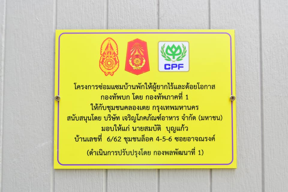 ทั้งนี้ CPF ร่วมโครงการกับกองทัพบก สนับสนุนการสร้างบ้านให้กลุ่มเปราะบาง ในพื้นที่ชุมชนคลองเตยล็อค 4-5-6 ทั้งหมด 87 หลัง รวมมูลค่า 13,998,000 บาท แบ่งเป็น โครงการที่ 1 จำนวน 40 หลัง คิดเป็นมูลค่า 5,200,000 บาท และสนับสนุนการสร้างบ้านพักต่อเนื่องในโครงการที่ 2 อีก 47 หลัง มูลค่า 8,798,000 บาท ซึ่งทยอยส่งมอบไปแล้ว 34 หลัง และครั้งนี้เป็นการมอบอีก 6 หลัง ส่วนที่เหลืออีก 7 หลัง จะส่งมอบได้ทั้งหมดภายในปี 2565 สำหรับบ้านทุกหลังของโครงการฯ ออกแบบจากทีมสถาปนิก Vin Varavarn Architects Ltd. นำโดยคุณวิน ม.ล.วรุตม์ วรวรรณ ซึ่งเข้ามาร่วมกับเครือซีพี ตั้งแต่เฟส 2 ดีไซน์บ้านแบบกึ่ง Custom-made คือมีรูปแบบ Prototype อาคารเบื้องต้น แล้วปรับเปลี่ยนเพิ่มเติมสำหรับแต่ละครอบครัวโดยเฉพาะ เรียบง่ายโมเดิร์น หลังคามีชายคาเพื่อให้กลมกลืนกับบ้านโดยรอบชุมชน มีพื้นที่ใช้สอยอย่างคุ้มค่า รวมทั้งสีสันและความสดใสตามที่ชาวบ้านต้องการ ท่ามกลางสภาพแวดล้อมที่ดี เพื่อเสริมสร้างความมั่นคงให้แก่สมาชิกในครอบครัว ซึ่งเป็นรากฐานสำคัญนำไปสู่การพัฒนาประเทศอย่างยั่งยืนต่อไป