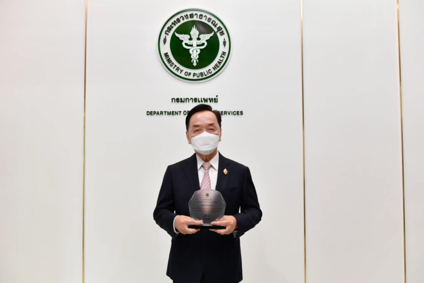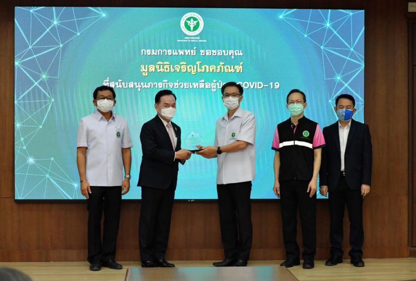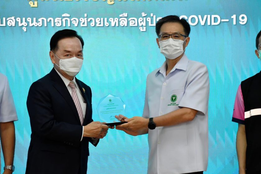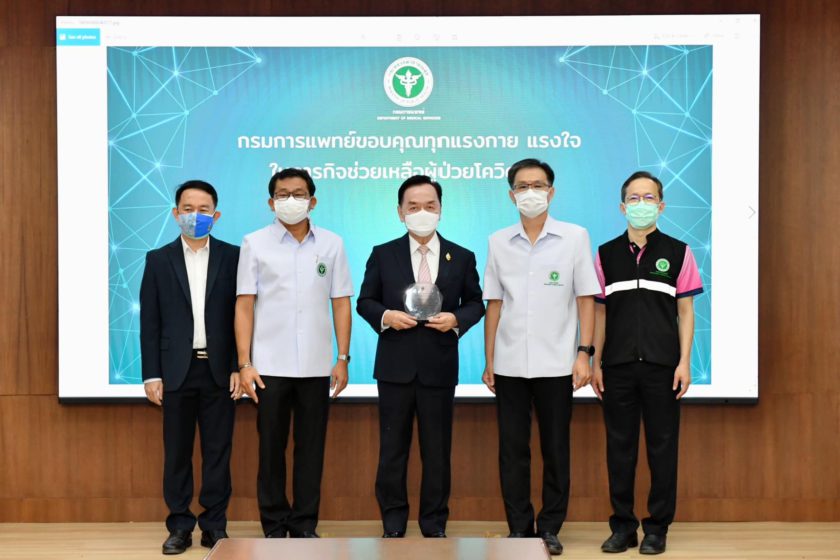 นพ.สมศักดิ์ อรรฆศิลป์ อธิบดีกรมการแพทย์ มอบโล่ขอบคุณแด่ คุณวรวิทย์ เจนธนากุล กรรมการบริหาร CPF และ กรรมการและเลขานุการ มูลนิธิเจริญโภคภัณฑ์ จาก ก.สาธารณสุข ในโอกาสที่เครือ CP-CPF และมูลนิธิฯ ให้การสนับสนุนการดำเนินงานของ “ภารกิจแรกรับและส่งต่อนิมิบุตร” ตลอดระยะเวลาที่เปิดให้การช่วยเหลือผู้ป่วยโควิด-19 แบ่งเบาภาระของบุคลากรทางการแพทย์ในสถานการณ์การแพร่ระบาดดังกล่าวจนสำเร็จลุล่วง โดยมี รองอธิบดีกรมการแพทย์ นพ.ไพโรจน์ สุรัตนวนิช พร้อมด้วย นพ.วีรวุฒิ อิ่มสำราญ และ นพ.ณัฐพงศ์ วงศ์วิวัฒน์ ร่วมด้วย ณ ห้องประชุมแสงสิงแก้ว กรมการแพทย์ ก.สาธารณสุข