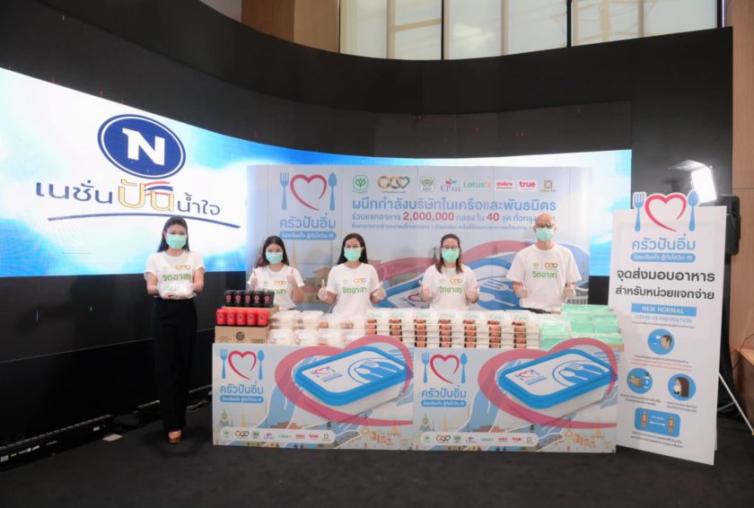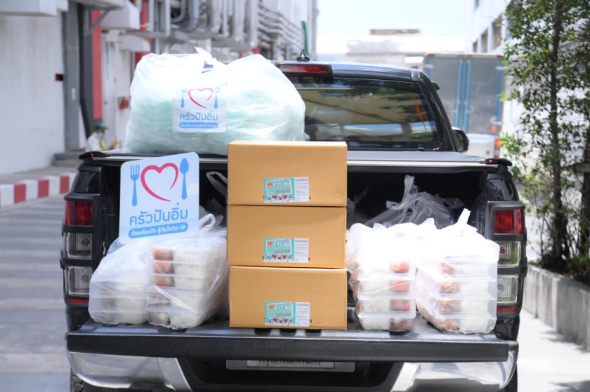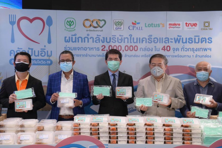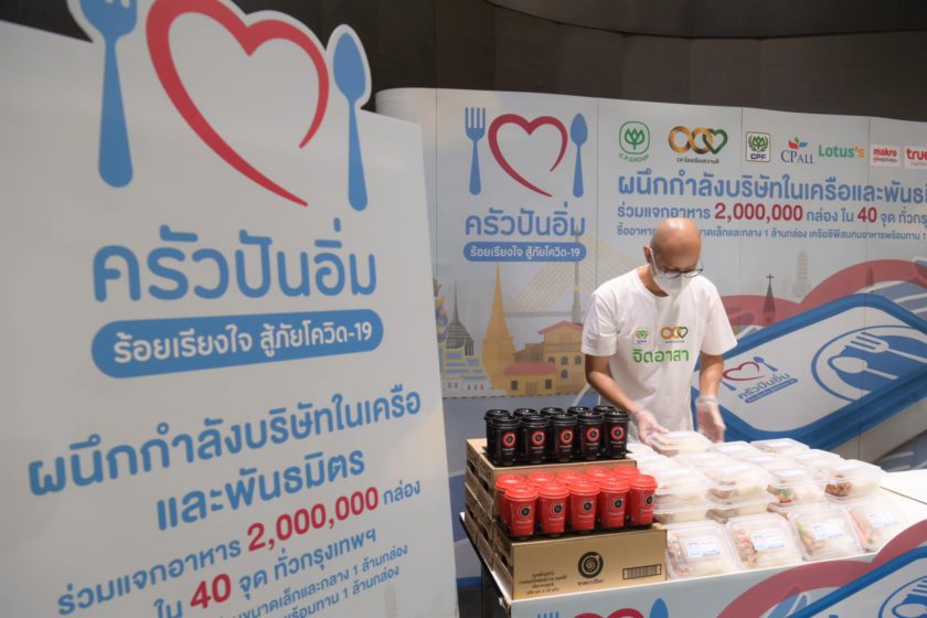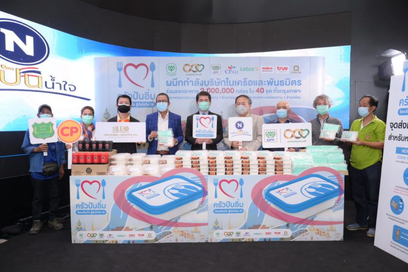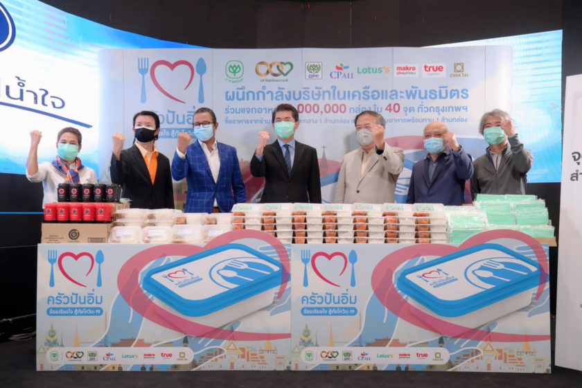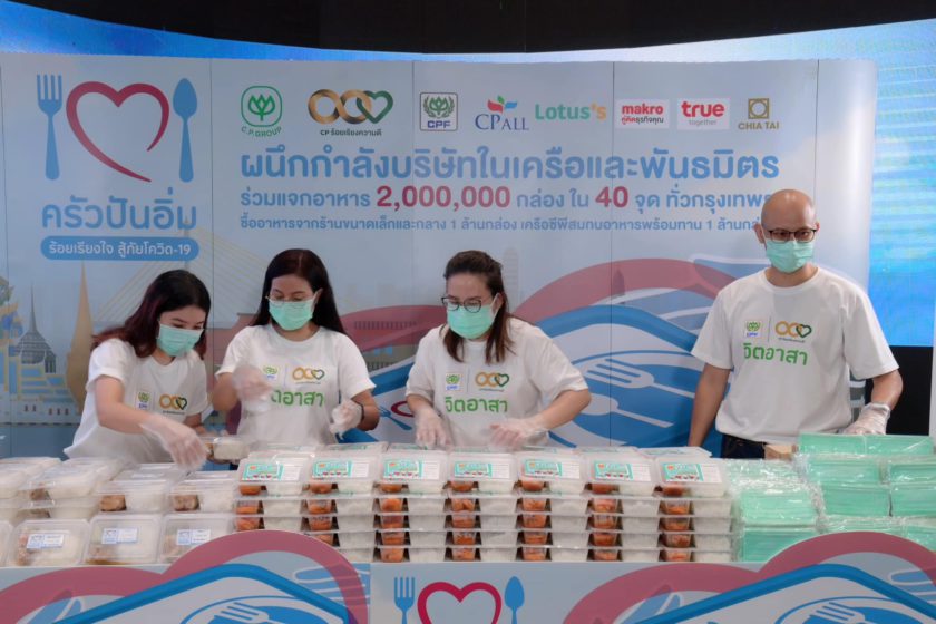 โครงการ “ครัวปันอิ่ม ร้อยเรียงใจ สู้ภัยโควิด-19” เป็นการผนึกกำลังเครือเจริญโภคภัณฑ์ CPF ร่วมกับพันธมิตรกว่า 100 องค์กร ส่งมอบข้าวกล่องอุ่นร้อนพร้อมทาน 2 ล้านกล่อง ประกอบด้วย 1 ล้านกล่องแรกมาจากร้านอาหารรายย่อยใน กทม. และปริมณฑล และอีก 1 ล้านกล่อง มาจากเครือ CP โดย CPF ผลิตอาหารที่ปรุงใหม่ สุก สะอาด ถูกสุขอนามัย มีเมนูอาหารที่หลากหลายในแต่ละวัน โดยให้เครือข่ายจิตอาสา มูลนิธิ และพันธมิตร รับอาหารไปกระจายสู่ชุมชนที่ได้รับผลกระทบจากโควิดอีกครั้ง เพื่อช่วยบรรเทาความเดือดร้อนแก่ผู้ที่ขาดรายได้ ว่างงาน กลุ่มเปราะบาง กลุ่มที่กักตัวดูอาการ และผู้ที่รักษาตัวที่บ้านหรือ Home Isolation ตลอดจนธุรกิจร้านอาหารรายย่อย ให้สามารถฝ่าวิกฤตโควิดไปได้