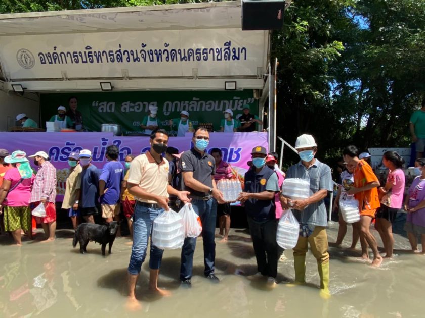 คุณวรวิทย์ เวียนสันเทียะ ผู้ใหญ่บ้าน หมู่ที่ 6 และ คุณบุญมี ประโคนทัน ผู้ใหญ่บ้าน หมู่ที่ 7 ต.กำปัง อ.โนนไทย จ.นครราชสีมา กล่าวว่า ทั้งสองหมู่บ้านถูกน้ำท่วมทั้งหมด ระดับน้ำสูงกว่า 1-2 เมตร ทำให้ประชากรร่วม 400 หลังคาเรือนได้รับผลกระทบ ชาวบ้านที่บ้านยังถูกน้ำท่วมสูงต้องใช้เรือนำอาหารและน้ำดื่มเข้าแจกจ่ายนับตั้งแต่เกิดเหตุการณ์น้ำท่วมขึ้น CPF ได้เร่งเข้าช่วยเหลือในทันที โดยมอบวัตถุดิบอาหาร ทั้งเนื้อสุกร ไข่ไก่ และน้ำดื่มซีพี เพื่อสนับสนุนโรงครัวสนามของทหาร ช.พัน.3 พล.ร.3 ในการประกอบอาหารมอบให้แก่ประชาชนที่เดือดร้อนและขาดแคลนอาหาร-น้ำดื่ม ขอขอบคุณ CPF ที่อยู่เคียงข้างชาวโคราชในทุกวิกฤต