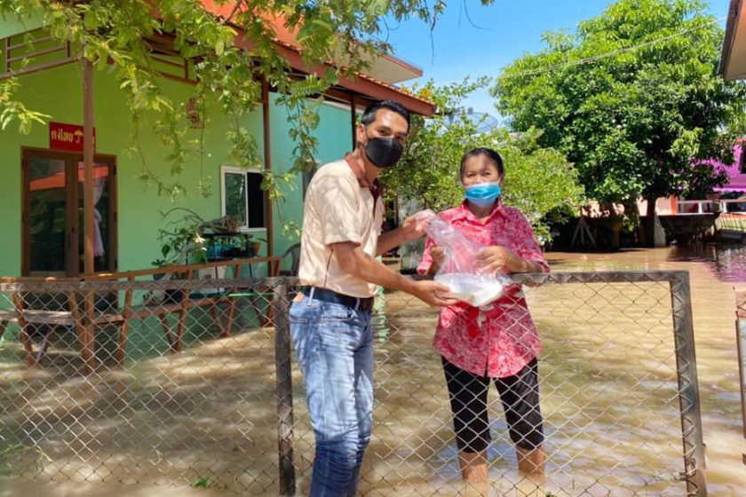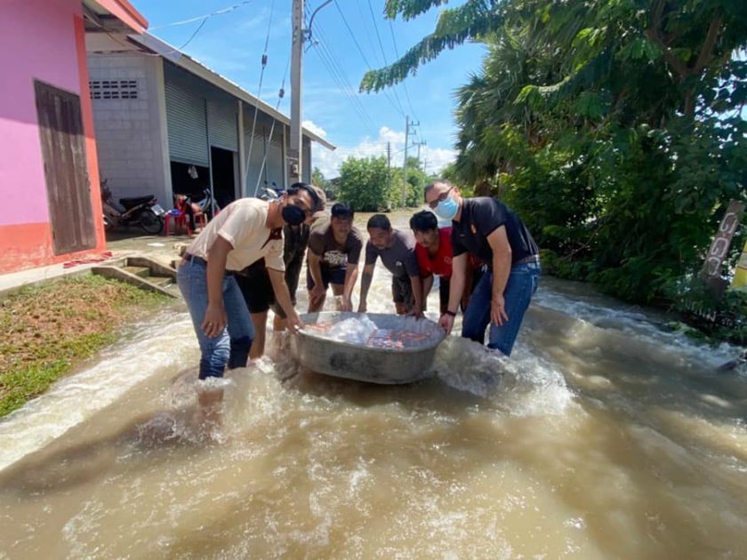 บางจุดต้องนำเรือเข้าไปช่วยคนชราและคนป่วยออกมา เพราะมีน้ำท่วมสูง ไฟฟ้าถูกตัดขาด ขอบคุณ CPF โดยฟาร์มศรีเทพ ซึ่งเป็นหนึ่งในสมาชิกของชุมชน ที่ได้เข้ามาดำเนินธุรกิจฟาร์มเลี้ยงสุกรใน ต.คลองกระจัง ที่ให้ความร่วมมือที่ดีกับชุมชนมาโดยตลอด เมื่อมีวิกฤตก็สนับสนุนด้านอาหารอย่างเร่งด่วน