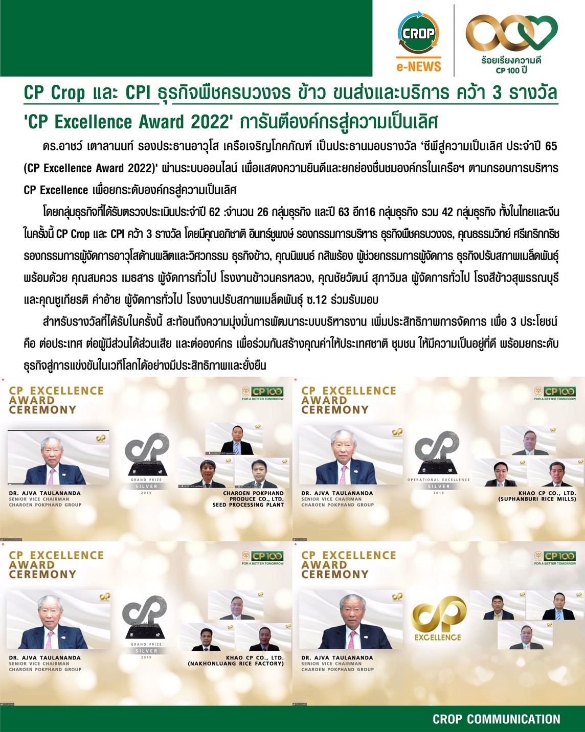 ดร.อาชว์ เตาลานนท์ รองประธานอาวุโส เครือเจริญโภคภัณฑ์ เป็นประธานมอบรางวัล ‘ซีพีสู่ความเป็นเลิศ ประจำปี 65 (CP Excellence Award 2022)’ ผ่านระบบออนไลน์ เพื่อแสดงความยินดีและยกย่องชื่นชมองค์กรในเครือฯ ตามกรอบการบริหาร CP Excellence เพื่อยกระดับองค์กรสู่ความเป็นเลิศ