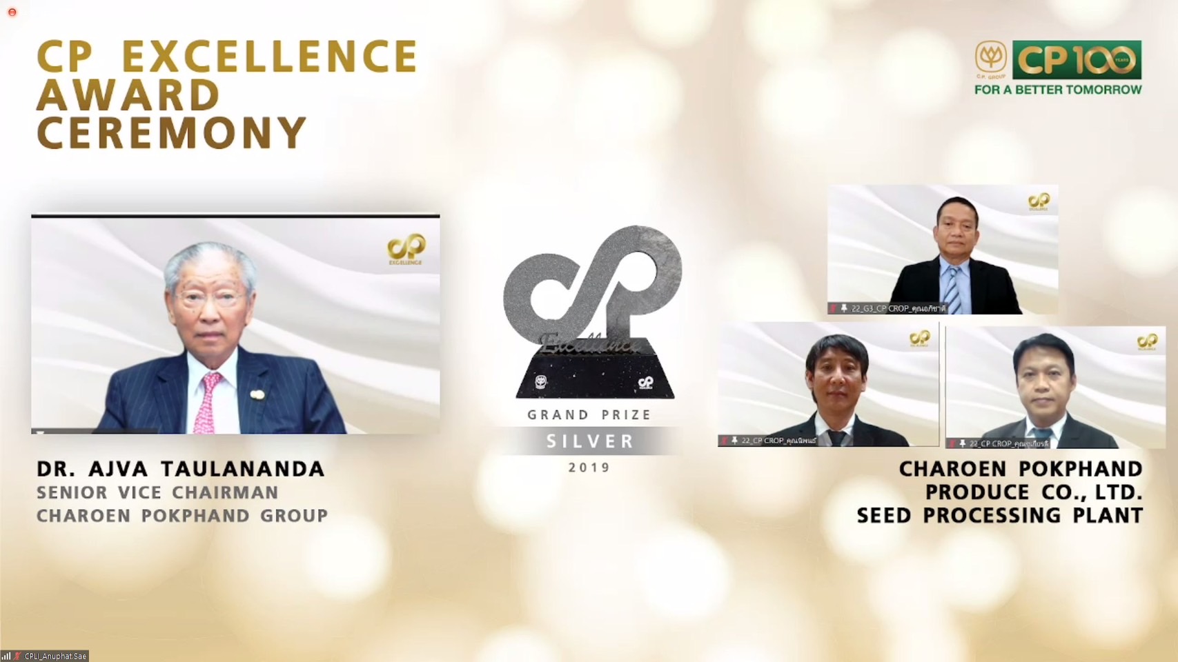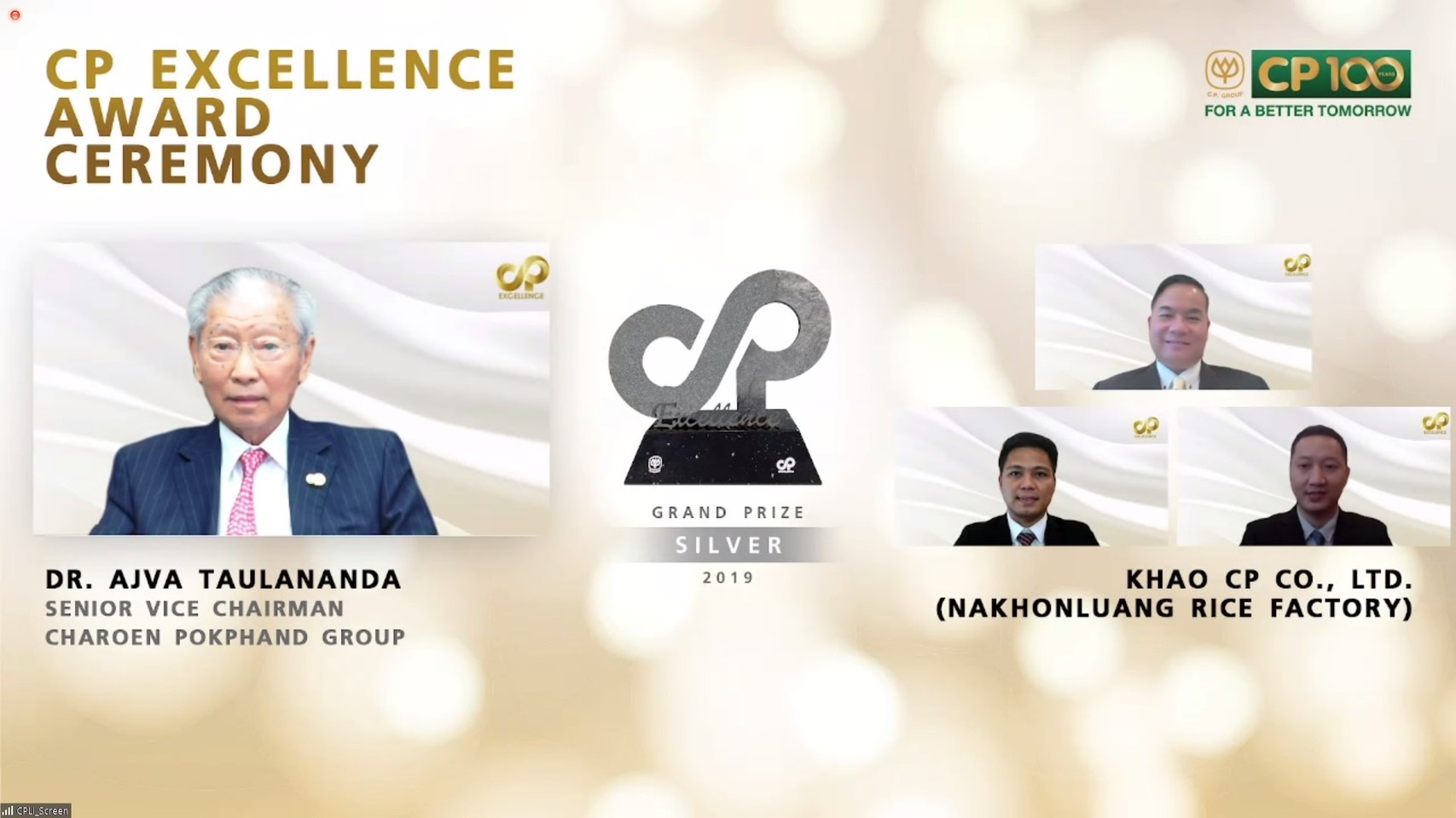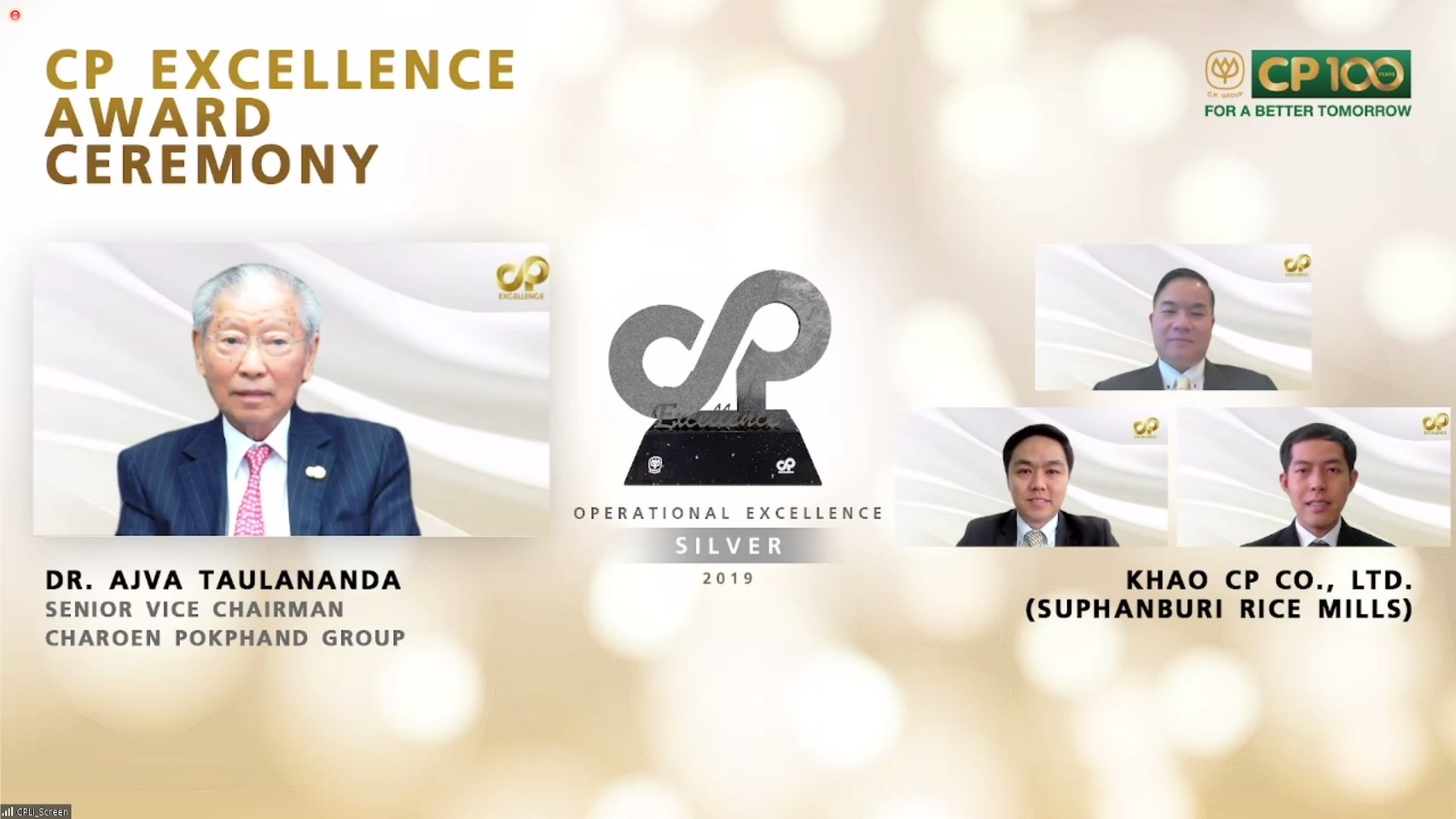 โดยกลุ่มธุรกิจที่ได้รับตรวจประเมินประจำปี 62 :จำนวน 26 กลุ่มธุรกิจ และปี 63 อีก16 กลุ่มธุรกิจ รวม 42 กลุ่มธุรกิจ ทั้งในไทยและจีน ในครั้งนี้ CP Crop และ CPI คว้า 3 รางวัล โดยมีคุณอภิชาติ อินทร์ชูพงษ์ รองกรรมการบริหาร ธุรกิจพืชครบวงจร, คุณธรรมวิทย์ ศรีเกริกกริช รองกรรมการผู้จัดการอาวุโสด้านผลิตและวิศวกรรม ธุรกิจข้าว, คุณนิพนธ์ กสิพร้อง ผู้ช่วยกรรมการผู้จัดการ ธุรกิจปรับสภาพเมล็ดพันธ์ พร้อมด้วย คุณสมควร เมธสาร ผู้จัดการทั่วไป โรงงานข้าวนครหลวง, คุณชัยวัฒน์ สุภาวิมล ผู้จัดการทั่วไป โรงสีข้าวสุพรรณบุรี และคุณชูเกียรติ คำอ้าย ผู้จัดการทั่วไป โรงงานปรับสภาพเมล็ดพันธุ์ ซ.12 ร่วมรับมอบ