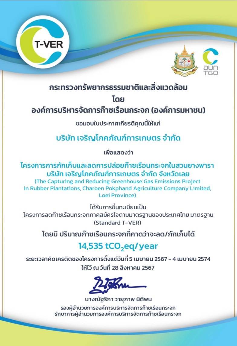 คณะกรรมการฯ องค์การบริหารจัดการก๊าซเรือนกระจก {องค์การมหาชน} หรือ อบก. มีมติเห็นชอบให้ขึ้นทะเบียน “โครงการกักเก็บและลดการปล่อยก๊าซเรือนกระจกในสวนยางพารา บริษัท เจริญโภคภัณฑ์การเกษตร จำกัด จังหวัดเลย {The Capturing and Reducing Greenhouse Gas Emissions Project in Rubber Plantations, Charoen Pokphand Agriculture Company Limited, Loei Province.}” ตามมาตรฐานของประเทศไทย {Standard T-VER} ประเภทการลด ดูดซับ และการกักเก็บก๊าซเรือนกระจกจากภาคป่าไม้และการเกษตร {FOR&AGI} ในพื้นที่เกษตรกรในโครงการฯ จำนวน 3,400.35 ไร่ มีปริมาณก๊าซเรือนกระจกที่คาดว่าจะลด/กักเก็บได้ 14,535 tCO2eq/year ระยะเวลาคิดเครดิตของโครงการ 7 ปี {5 เมษายน 2567 – 4 เมษายน 2574} คาดการณ์คาร์บอนเครดิต 7 ปี รวม 101,745 tCO2eq