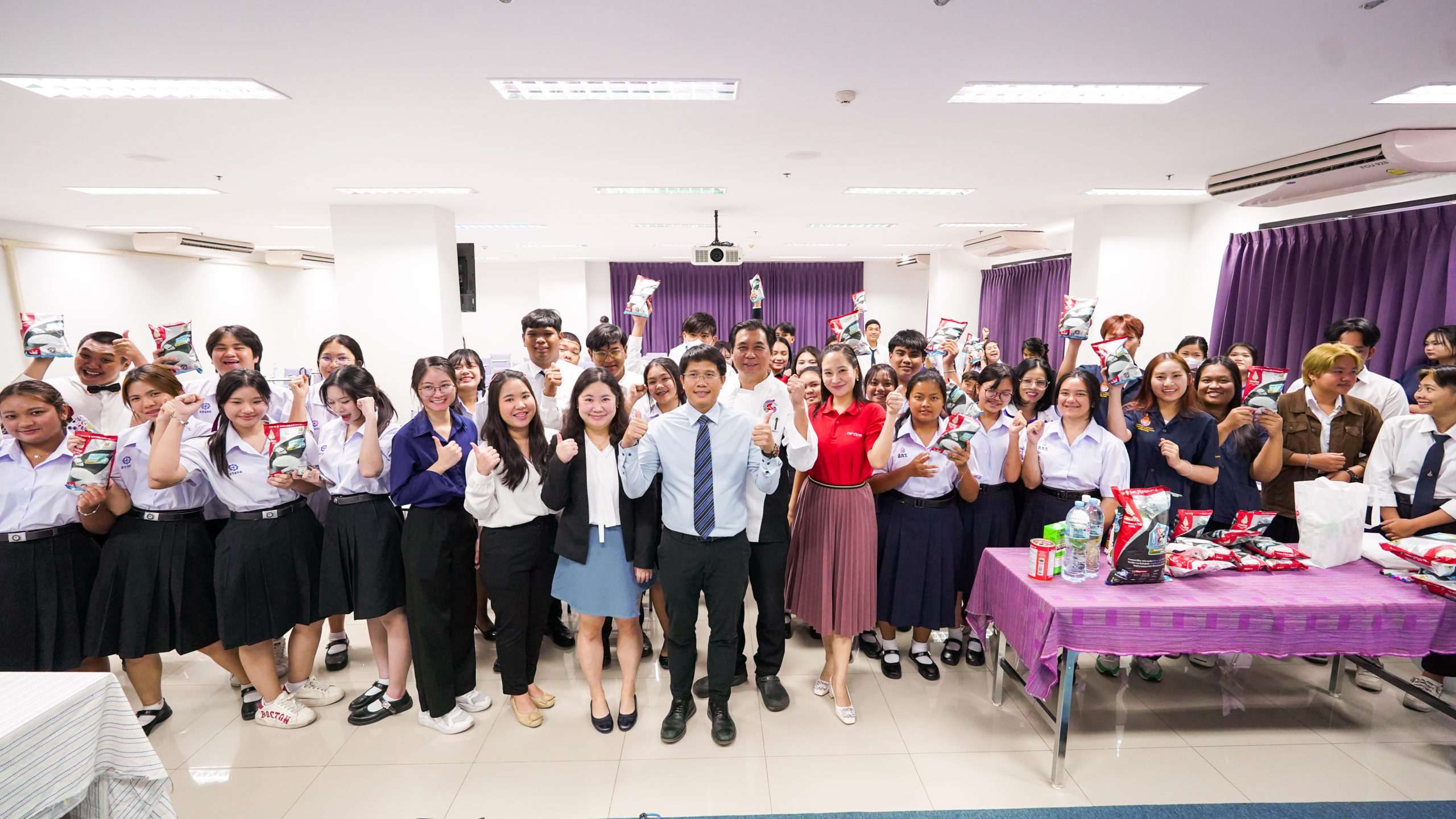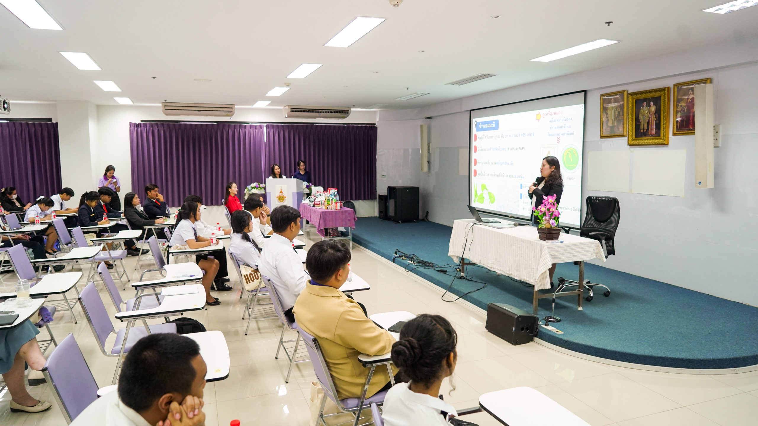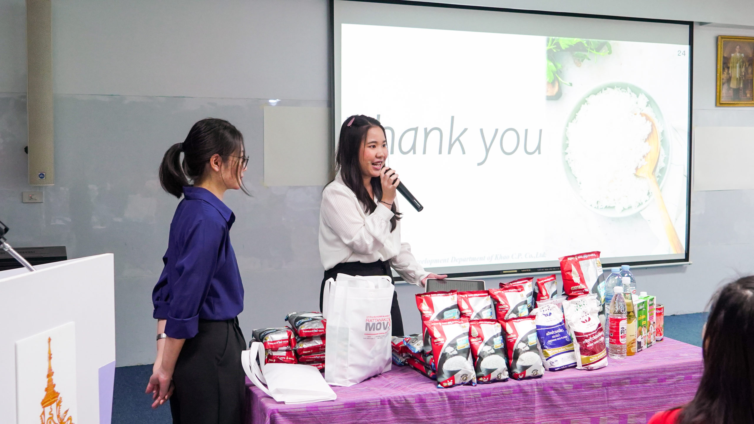 คุณเด่นเดือน พืชเกื้อกูล ผู้จัดการฝ่ายวิจัยและพัฒนาผลิตภัณฑ์ พร้อมด้วยทีมงานตัวแทนจากข้าวตราฉัตร ร่วมเป็นวิทยากรให้ความรู้เรื่องข้าวพร้อมแนะนำการจำแนกชนิด องค์ประกอบของเมล็ดและเทคนิคการหุงข้าว สร้างความเชื่อมั่นในคุณภาพข้าวไทยและร่วมเป็นส่วนหนึ่งในการผลักดัน Soft Power ด้านอาหารไทยนำชื่อเสียงไปยังระดับเวทีโลก