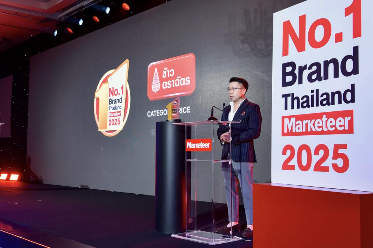 คุณยงยุทธ พฤกษ์มหาดำรง รองกรรมการผู้จัดการบริหาร ข้าวตราฉัตร ขึ้นรับรางวัลข้าวยอดนิยมอันดับ 1 ในใจผู้บริโภคต่อเนื่องเป็นปีที่ 14 จากรางวัล “Marketeer No.1 Brand Thailand 2025 ” หรือรางวัลแบรนด์ยอดนิยมอันดับ 1 ในใจผู้บริโภคทั่วประเทศไทย ในหมวดธุรกิจข้าวสารบรรจุถุง