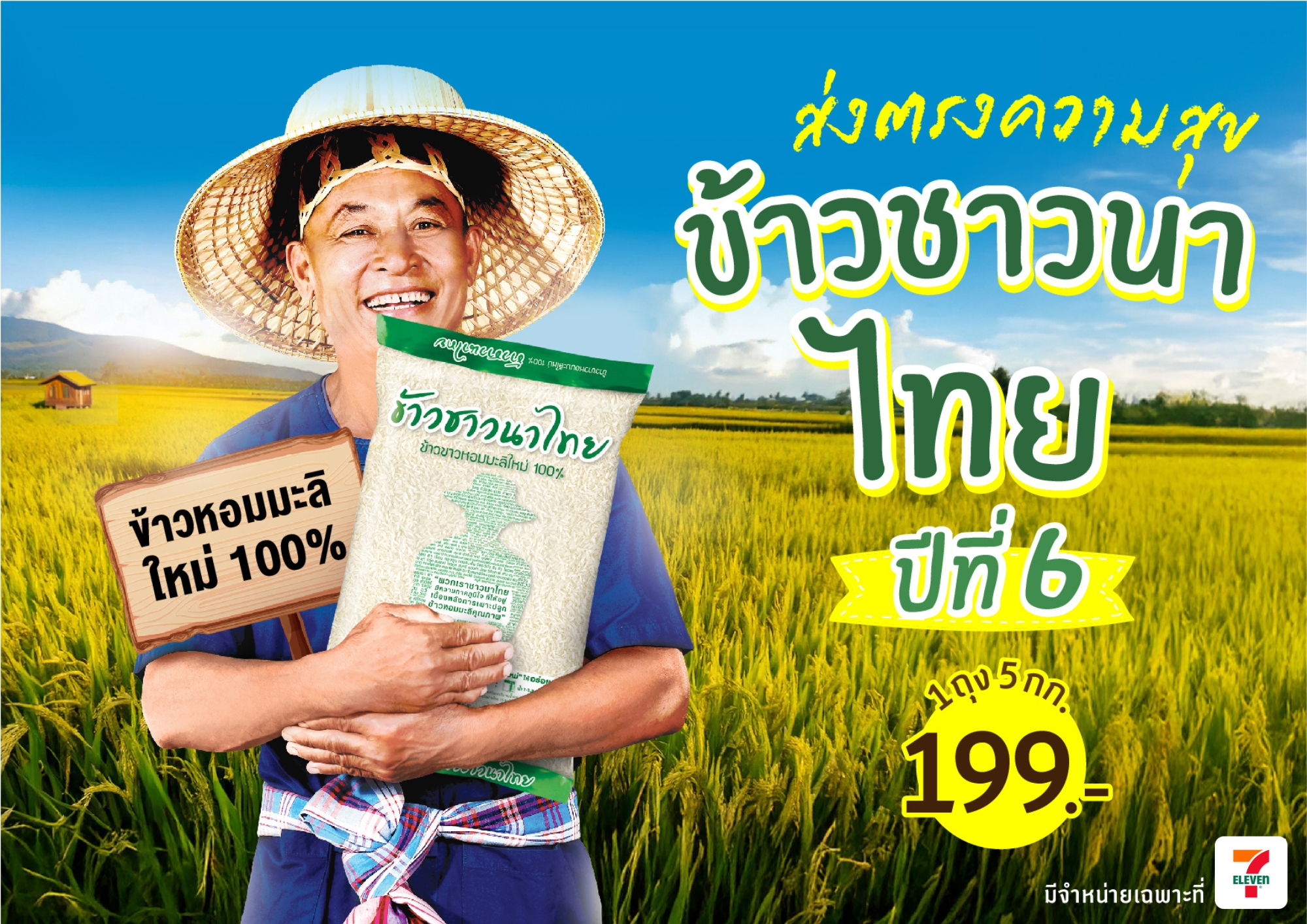 ข้าวชาวนาไทยร่วมสนับสนุนเกษตรกรผู้ปลูกข้าวหอมมะลิ ตั้งแต่กระบวนการต้นน้ำด้วยการรับซื้อ ข้าวหอมมะลิคุณภาพจากเกษตรกรโดยตรง พร้อมเข้าสู่กระบวนการผลิตมาตรฐานระดับสากล การันตีคุณภาพด้วยแบรนด์ข้าวตราฉัตร พร้อมผนึกกำลังธุรกิจภายใต้เครือเจริญโภคภัณฑ์ พร้อมส่งมอบรอยยิ้มสร้างความภูมิใจให้กับทุกการเก็บเกี่ยวของพี่น้องชาวนาไทย จำหน่ายขนาด 5 กิโลกรัม ราคาเพียง 199 บาทเริ่มจำหน่าย 23 มกราคมนี้ อร่อยกับข้าวใหม่ เกี่ยวสดจากนา ได้แล้ววันนี้ที่ เซเว่นอีเลฟเว่น