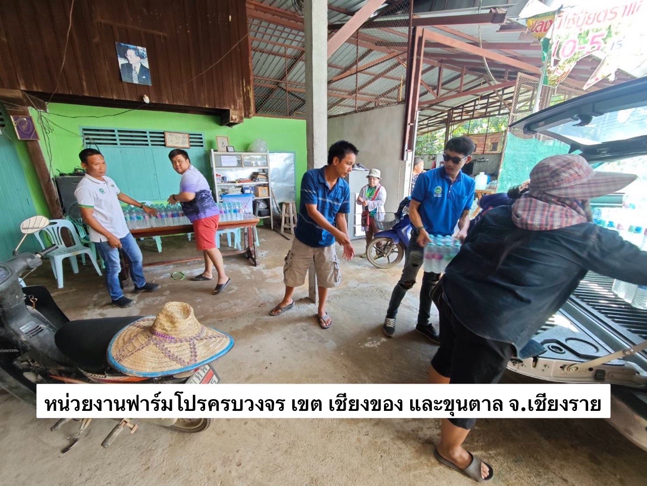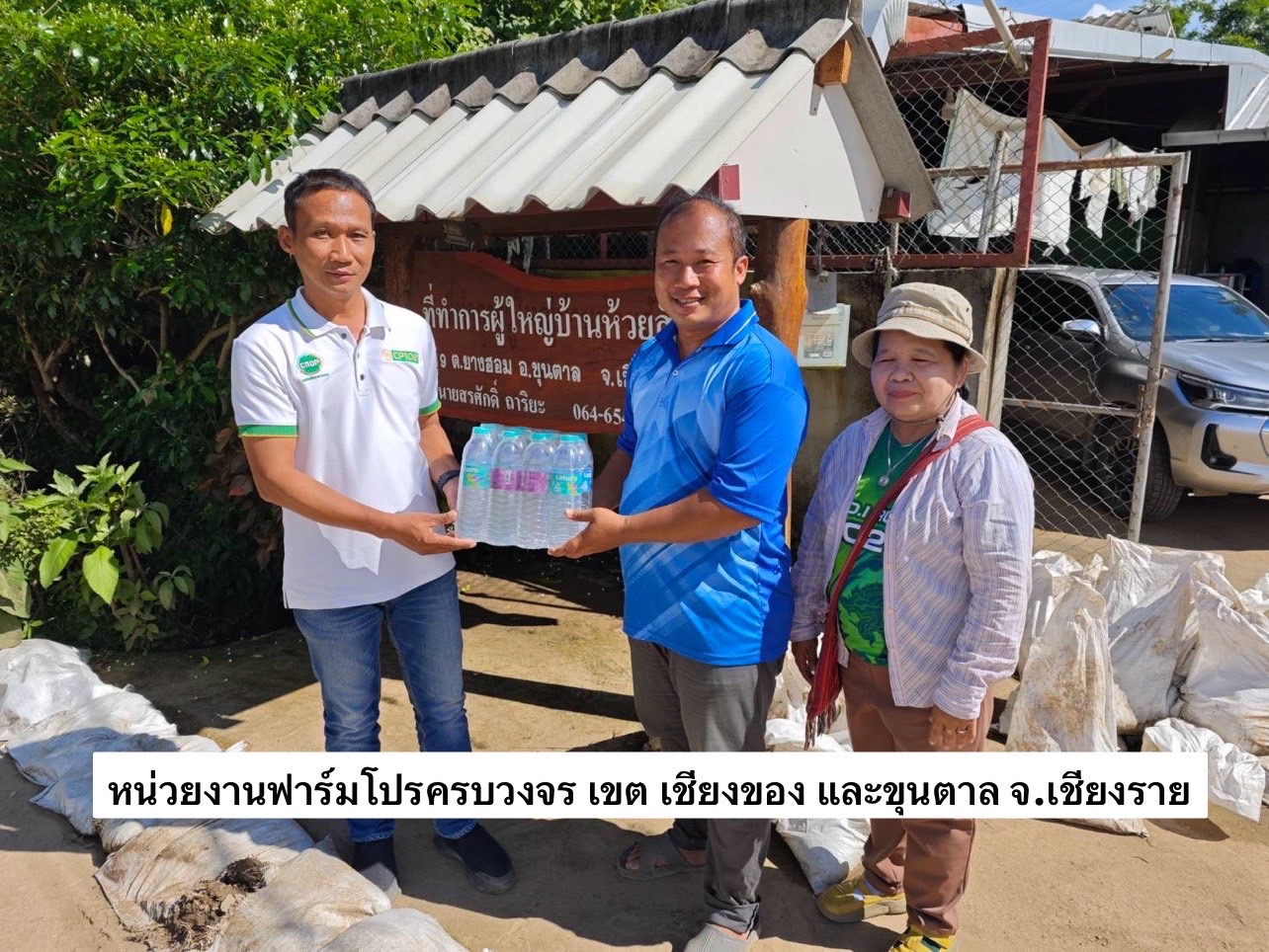 กลุ่มธุรกิจพืชครบวงจร ข้าว ขนส่งและบริการ CPCRT เครือเจริญโภคภัณฑ์ ร่วมส่งความห่วงใย ช่วยเหลือผู้ประสบภัยน้ำท่วมในพื้นที่ จ.เชียงราย , จ.แพร่ และจังหวัดภูเก็ต เพื่อส่งมอบเครื่องอุปโภค บริโภค ของใช้จำเป็นเพื่อช่วยเหลือและบรรเทาความเดือดร้อนในเบื้องต้น โดยหน่วยงานฟาร์มโปรครบวงจร เขตเชียงของและขุนตาล ร่วมส่งความห่วงใย ช่วยเหลือผู้ประสบภัยน้ำท่วม จ.เชียงราย ผ่านผู้นำชุมชนพื้นที่ – บ้านเต๋น หมู่ 8 ต.สถาน อ.เชียงของ จ.เชียงราย – บ้านห้วยสัก หมู่ 9 ต.ยางฮอม อ.ขุนตาล จ.เชียงราย มอบน้ำดื่ม จำนวน 200 แพ็ค