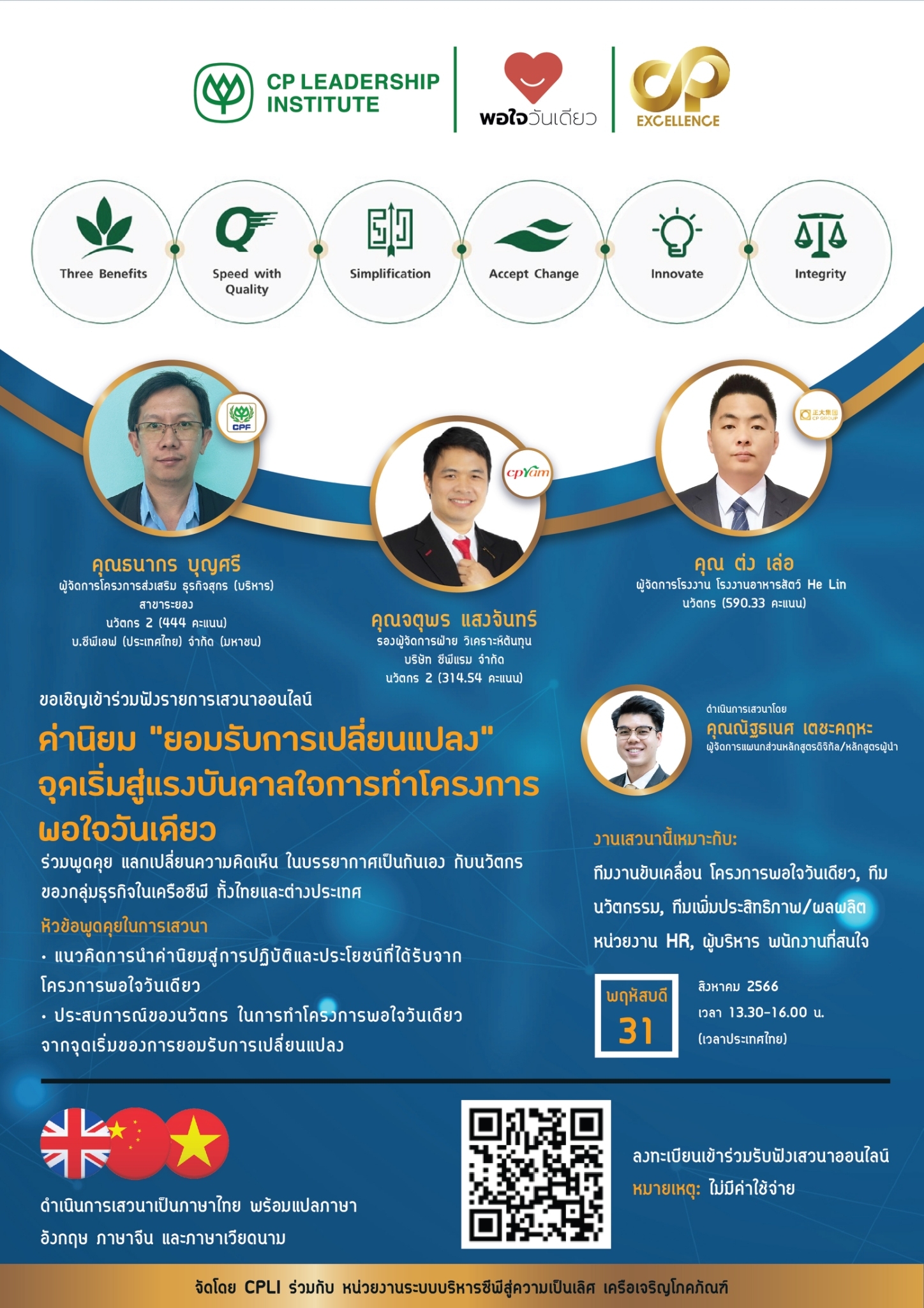 หน่วยงานระบบบริหารซีพีสู่ความเป็นเลิศ (CP Excellence Management System Division – CPEX) ร่วมกับสถาบันพัฒนาผู้นำ (CP Leadership Institute – CPLI) เครือเจริญโภคภัณฑ์ เตรียมจัดรายการเสวนาในรูปแบบออนไลน์ หัวข้อ “ค่านิยม “ยอมรับการเปลี่ยนแปลง” จุดเริ่มสู่แรงบันดาลใจการทำโครงการพอใจวันเดียว”