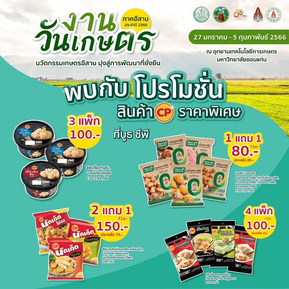 คุณอลงกรณ์ พลบุตร ที่ปรึกษา รมว.เกษตรและสหกรณ์ เป็นประธานเปิดงานเกษตรภาคอีสาน ประจำปี 2566 ภายใต้แนวคิด “นวัตกรรมเกษตรอีสาน มุ่งสู่การพัฒนาที่ยั่งยืน” พร้อมมอบโล่ขอบคุณ CPF ที่ให้การสนับสนุน โดย CPF โชว์ศักยภาพ “ครัวของโลกที่ยั่งยืน” นำผลิตภัณฑ์อาหารแห่งอนาคต สะอาด ปลอดภัย และมีคุณค่าทางโภชนาการ จากกระบวนการผลิตที่ใช้เทคโนโลยีทันสมัย ได้มาตรฐานสากล สามารถตรวจสอบย้อนกลับได้ทุกขั้นตอน และเป็นมิตรกับสิ่งแวดล้อม ทั้งอาหารพร้อมปรุง อาหารพร้อมทาน และอาหารแช่แข็ง แบรนด์ CP ห้าดาว ไฮพอร์ค และ MEAT ZERO เอาใจคนรักสุขภาพ พร้อมโปรโมชั่นพิเศษในราคาสุดคุ้ม ตอบโจทย์ผู้บริโภคทุกวัย โดยมี คุณวิโรจน์ ใจบุญมา รองกรรมการผู้จัดการ CPF เป็นผู้แทนบริษัทฯ รับมอบ