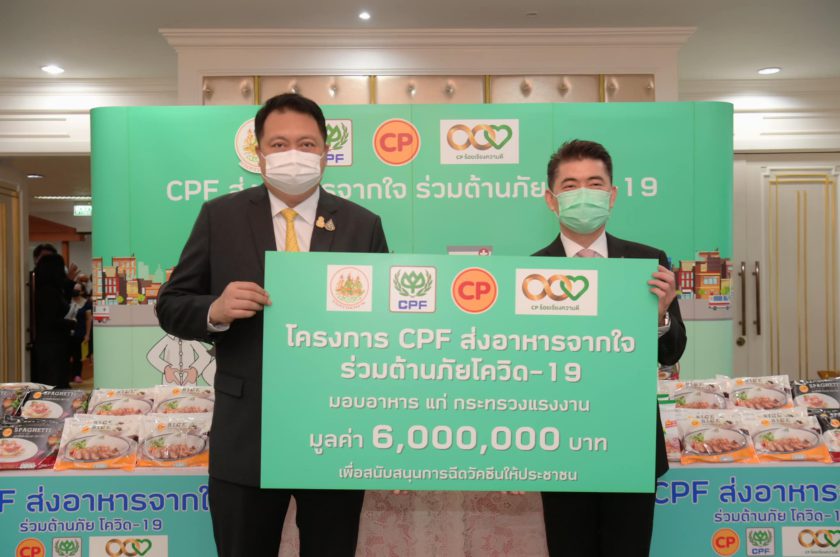 คุณสุชาติ ชมกลิ่น รมว.แรงงาน รับมอบผลิตภัณฑ์อาหารสำเร็จรูปพร้อมทานซีพี มูลค่า 6 ล้านบาท จาก CEO คุณประสิทธิ์ บุญดวงประเสริฐ ภายใต้โครงการ “CPF ส่งอาหารจากใจ ร่วมต้านภัยโควิด-19″ สนับสนุนการปฏิบัติงานของแพทย์ พยาบาล และเจ้าหน้าที่ประกันสังคม ในพื้นที่ฉีดวัคซีนสำหรับผู้ประกันตน 46 จุดทั่วกรุงเทพฯ เพื่อร่วมสร้างภูมิคุ้มกันหมู่ให้ประเทศ โดยมี คุณสุทธิ สุโกศล ปลัดกระทรวงแรงงาน และคุณพิมลรัตน์ รีพัฒนาวิจิตรกุล ประธานผู้บริหาร ทรัพยากรบุคคล CPF ร่วมด้วย ณ ก.แรงงาน