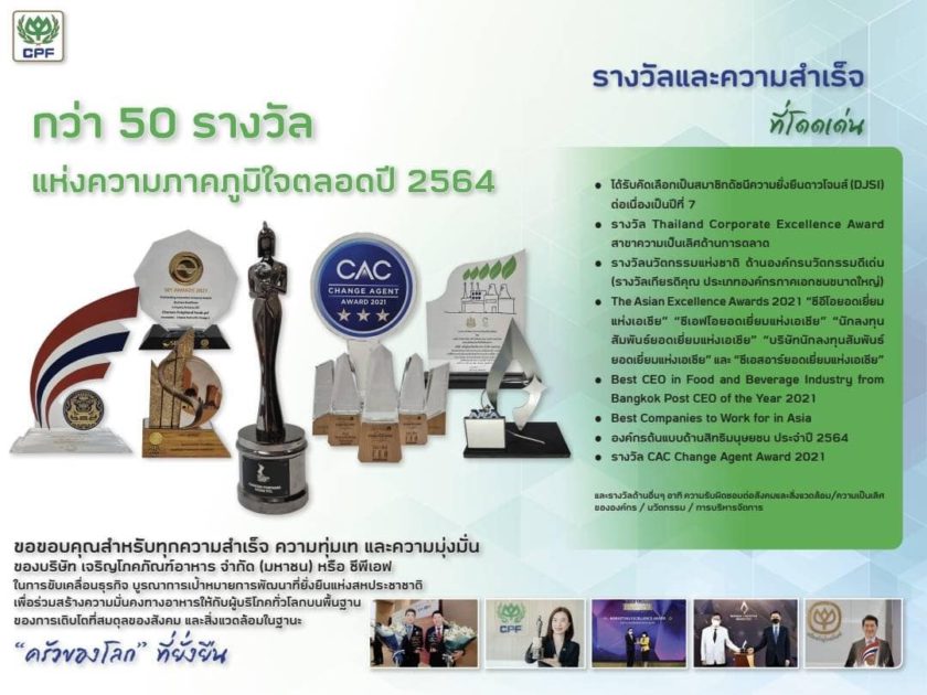 ขอขอบคุณผู้บริหารและพนักงาน CPF ทุกท่าน ทุกความสำเร็จ เกิดจากความทุ่มเทและความมุ่งมั่น ในการขับเคลื่อนธุรกิจ บูรณาการเป้าหมายพัฒนาที่ยั่งยืนแห่งสหประชาชาติ เพื่อร่วมสร้างความมั่นคงทางอาหารแก่ผู้บริโภคทั่วโลก บนพื้นฐานการเติบโตที่สมดุลของสังคม-สิ่งแวดล้อม ในฐานะ “ครัวของโลก” ที่ยั่งยืน