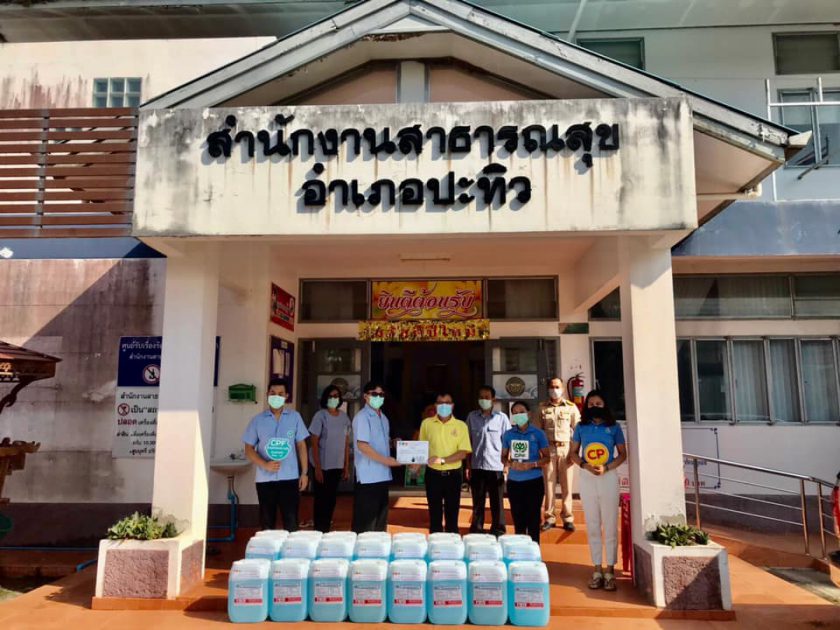เพื่อให้เจ้าหน้าที่นำไปกระจายมอบให้ผู้สูงวัยในชุมชนที่ป่วยติดเตียง ป้องกันการแพร่ระบาดของโควิด-19 ด้านโรงงานแปรรูปสัตว์น้ำระโนดของ CPF สนับสนุนแอลกอฮอล์ล้างมือผ่านผู้ใหญ่บ้าน หมู่ 10 ต.ท่าบอน อ.ระโนด จ.สงขลา และ อสม. เพื่อใช้บริการให้แก่ประชาชนที่มาซื้อของที่ตลาด โดยสามารถนำมาเติมแอลกอฮอล์ได้ตลอดจนกว่าสถานการณ์จะคลี่คลาย