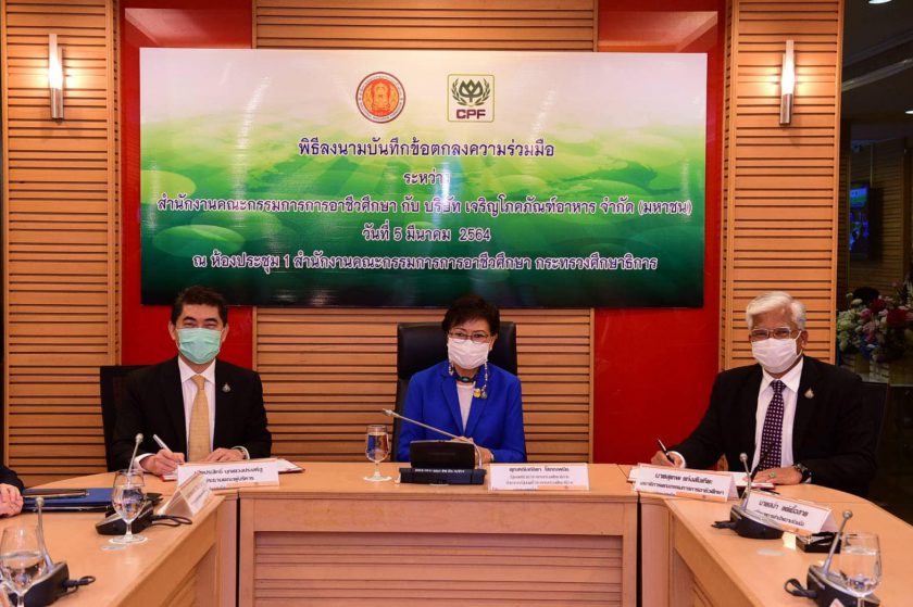 ด้านเลขาธิการคณะกรรมการอาชีวศึกษา กล่าวว่า ขอบคุณ CPFที่เห็นความสำคัญของการจัดการอาชีวศึกษาและร่วมมือในการผลิตและพัฒนากำลังคนสายอาชีพให้มีความรู้ ความสามารถ และทักษะในการประกอบอาชีพ และเปิดโอกาสให้นักเรียน นักศึกษา ได้ฝึกประสบการณ์วิชาชีพในหน่วยงานต่างๆของบริษัท รวมทั้งความร่วมมือในการจัดการเรียนการสอนระบบทวิภาคีและการฝึกงาน เชื่อมั่นว่าความร่วมมือครั้งนี้ จะเป็นประโยชน์ต่อการพัฒนาการศึกษาสายวิชาชีพให้มีศักยภาพ นำไปสู่การผลิตและการพัฒนากำลังคนที่มีคุณภาพ เพื่อเป็นกำลังสำคัญในการพัฒนาประเทศต่อไป