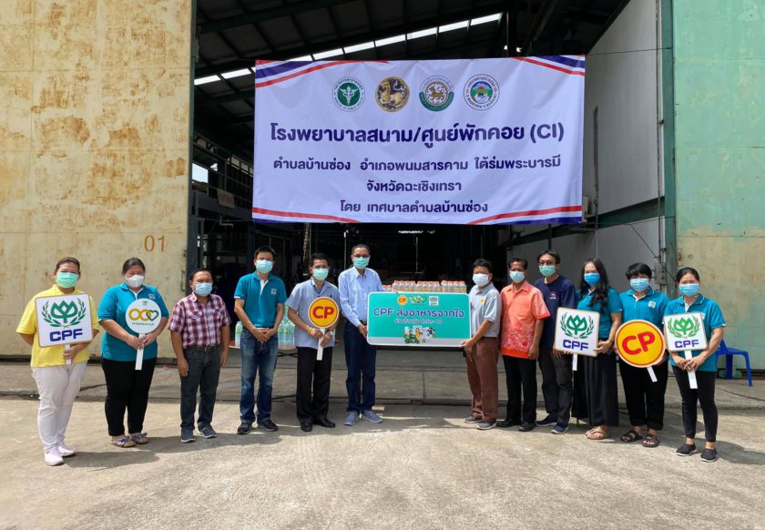 คุณสมศักดิ์ ภู่พนมภูมิ นายกเทศมนตรีเทศบาลตำบลบ้านซ่อง และคุณเอกชัย อรุณฉลาด ผอ.รพ.สต.หนองหว้า รับมอบน้ำดื่มซีพี 2,500 ขวด จาก CPF ในโครงการ “CPF ส่งอาหารจากใจ ร่วมต้านภัยโควิด-19” ตามนโยบายเครือซีพี เพื่อนำไปแจกจ่ายให้ผู้ป่วยโควิด โรงพยาบาลสนาม/ศูนย์พักคอย ต.บ้านซ่อง อ.พนมสารคาม จ.ฉะเชิงเทรา โดยมี คุณธีระพงษ์ สมบัติหลาย ผู้ช่วยกรรมการผู้จัดการ และชาว CPF ธุรกิจสุกรภาคตะวันออก เป็นตัวแทนบริษัทฯ มอบ