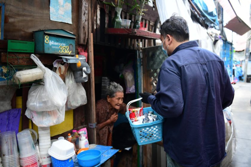 ระหว่างที่พูดคุยก็สังเกตเห็นสิ่งของจำเป็นวางอยู่ในตระกร้ามากมาย ล้วนเป็นของที่จะนำไปแจกจ่ายให้กับคนที่ขาดแคลน ด้วยแต่ละวันที่ได้เห็นชีวิตความเป็นอยู่ของคนในชุมชนและรับรู้สิ่งที่ทุกคนยังขาด โดยเฉพาะของใช้จำเป็นหลายอย่าง เค้าจึงนำตะกร้าที่บ้านมาใส่สบู่ ยาสีฟัน ยารักษาโรค อาหารแห้งต่างๆ เพื่อนำไปแจกจ่าย และตั้งชื่อว่า “รถตะกร้าปันสุข”