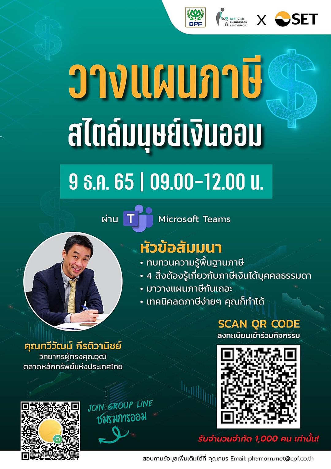 “CPF x SET” ชมรมการออมและการลงทุน มอบของขวัญส่งท้ายปีกับหลักสูตร “วางแผนภาษี สไตล์มนุษย์เงินออม” โดย คุณทวีวัฒน์ กีรติวานิชย์ วิทยากรผู้ทรงคุณวุฒิ จากตลาดหลักทรัพย์แห่งประเทศไทย ผ่านออนไลน์ MS Teams