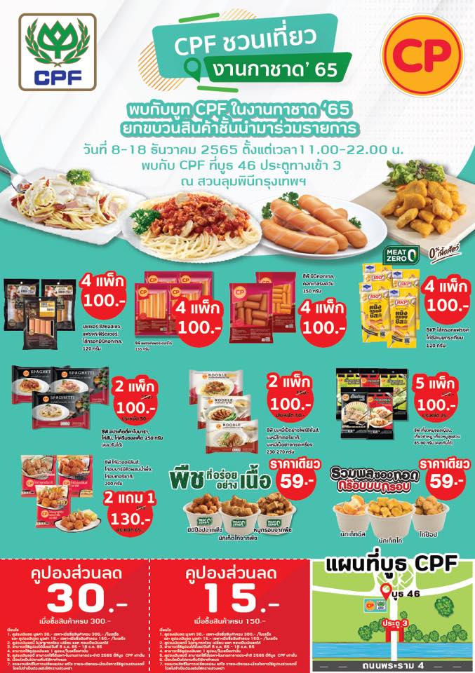 CPF ส่งมอบความสุขให้คนไทยส่งท้ายปี ยกขบวนอาหารอร่อยคุณภาพปลอดภัย ทั้งอาหารพร้อมปรุงและอาหารพร้อมทาน มาให้ชิมและช้อปอยากจุใจ ภายใน “งานกาชาดประจำปี 2565” พร้อมโปรโมชั่นสุดคุ้มและคูปองพิเศษ เพื่อลดค่าครองชีพให้ประชาชน อาทิ ไส้กรอกซีพี ไส้กรอกบุชเชอร์ ซื้อ 4 แพ็ก ในราคา 100 บาท, เกี๊ยวซ่า เกี๊ยวซอสญี่ปุ่น เกี๊ยวลุยสวน ซื้อ 5 แพ็ก เพียง 100 บาท, เกี๊ยวกุ้งจักรพรรดิ นักเก็ตไก่ ไก่อบเทอริยากิ MEAT ZERO นวัตกรรมเนื้อจากพืช ซื้อ 2 แถม 1 ในราคา 130 บาท ตลอดจน บะช่อ CP Magic Chef รวมพลของทอดกร๊อบกรอบ เมนูข้าวและสปาเก็ตตี้รสชาติต่างๆ ซึ่งได้รับความสนใจจากผู้เข้าชมงานเป็นอย่างมาก