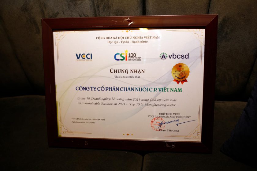 CP เวียดนาม ได้รับการจัดอันดับให้เป็น 1 ใน 10 บริษัท ในภาคการผลิตที่มีผลการดำเนินงานด้านความยั่งยืนโดดเด่นที่สุดของเวียดนาม (Top 10 sustainable companies in the manufacturing sector) ต่อเนื่องเป็นปีที่ 2 จากการประเมินของสภาพัฒนาธุรกิจอย่างยั่งยืนแห่งชาติเวียดนาม (Vietnam Business Council for Sustainable Development : VBCSD) สะท้อนให้เห็นความมุ่งมั่นของบริษัทฯ ในการเป็นผู้ผลิตอาหารที่ส่งมอบผลิตภัณฑ์ที่มีคุณค่าทางโภชนาการ จากกระบวนผลิตที่ยังยืนตลอดห่วงโซ่คุณค่าจากต้นน้ำ ไปจนถึงปลายน้ำ
