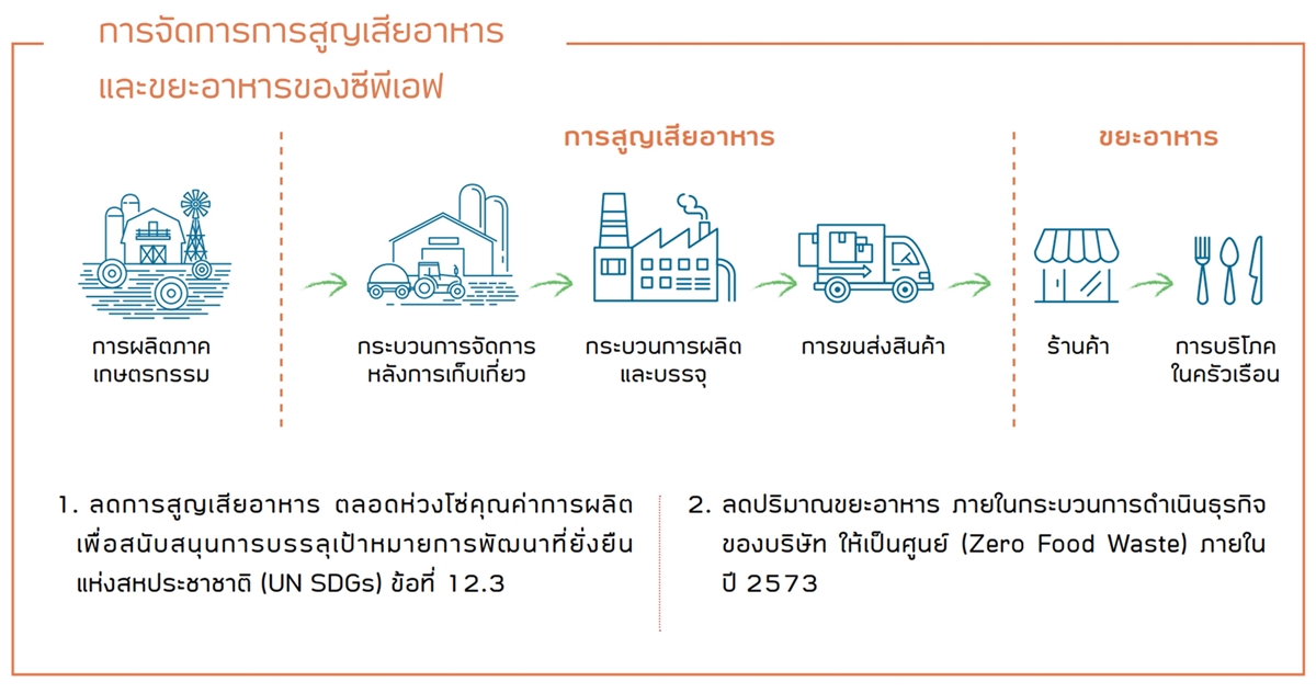 บริษัทเจริญโภคภัณฑ์อาหาร จำกัด (มหาชน) หรือ ซีพีเอฟ ประกาศนโยบายการจัดการอาหารสูญเสียและขยะอาหาร (Food Loss & Food Waste Policy) ในกระบวนการผลิตและห่วงโซ่อุปทาน โดยกำหนดเป้าหมายสำคัญในการลดอาหารส่วนเกินและขยะอาหารเป็น 0 ในปี 2573