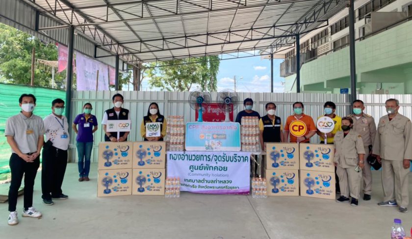 คุณสกุลยศ สามเสน รองกรรมการผู้จัดการอาวุโส และคุณจิระ คงเขียว ผู้ช่วยกรรมการผู้จัดการ นำชาว CPF จิตอาสา โรงงานผลิตอาหารสัตว์ท่าเรือ มอบน้ำดื่มซีพี 360 ขวด และพัดลมตั้งโต๊ะ 10 เครื่อง จาก CPF ในโครงการ “CPF ส่งอาหารจากใจ ร่วมต้านภัยโควิด-19” ตามนโยบายเครือซีพี ให้กับศูนย์พักคอยผู้ติดเชื้อโควิดระดับตำบล โดยมี คุณบำรุง ม่วงวิจิตร นายกเทศมนตรีตำบลท่าหลวง และสมาชิกเทศบาลตำบลท่าหลวงฯ รับมอบ